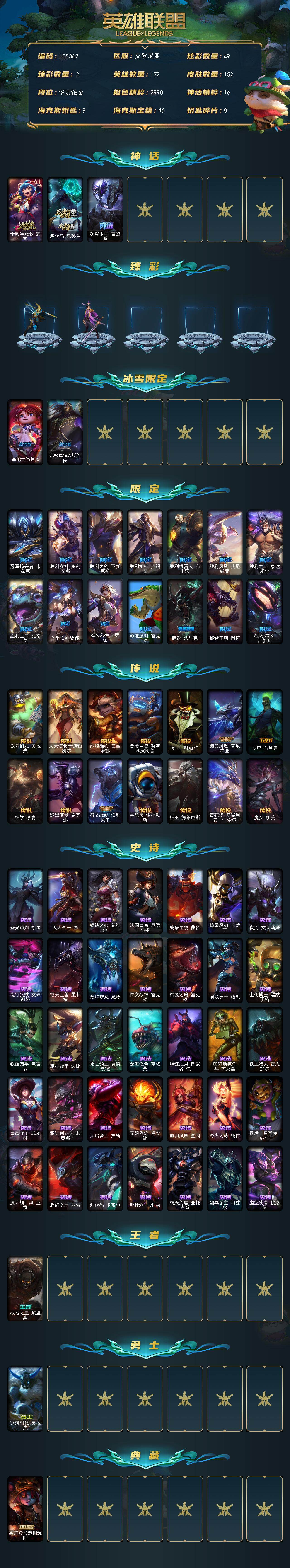 【LD5362】172英雄/152皮肤/3神话/17限定/2臻彩/49炫彩/14传说/35史诗/铂金/十周年纪念安妮/源代码乐芙兰/灰烬杀手塞拉斯/冠军之矛卡莉丝塔凯旋圣装/玉剑传说无极麒麟/圣诞玩偶波比/北极星猎人斯维因/冠军掠夺者卡兹克/胜利女神奥莉安娜/胜利之剑亚托克斯/胜利枪神卢锡安/胜利机器人布里茨/胜利凤凰艾尼维亚/胜利之王泰达米尔/胜利巨口克格莫/胜利女神娑娜/胜利女神菲奥娜/泳池派对雷克顿/暗影沃里克/都铎王朝图奇/战场BOSS吉格斯/铁哥们儿奥拉夫/大天使长米迦勒凯尔/烈焰雄心