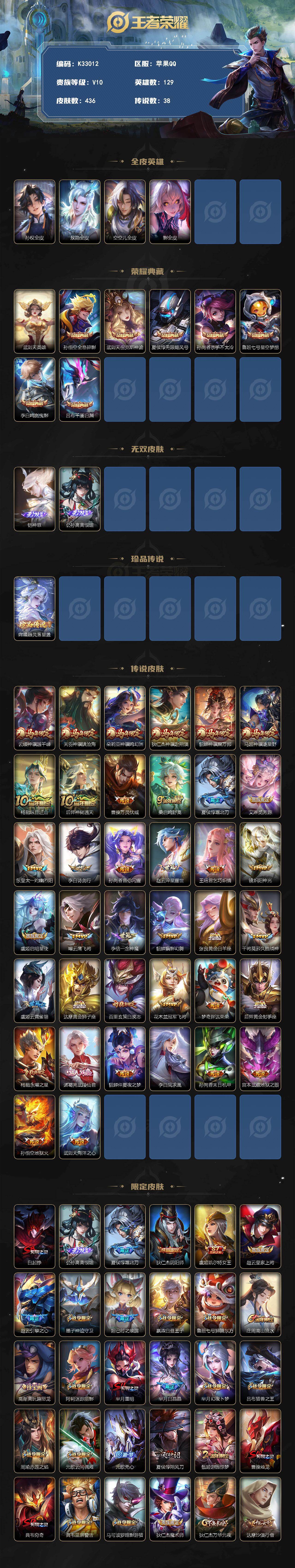 苹果Q-V10-最强王者段位-129英雄-436皮肤-7典藏皮肤-1典藏英雄-2无双-1珍品传说-38传说-133史诗