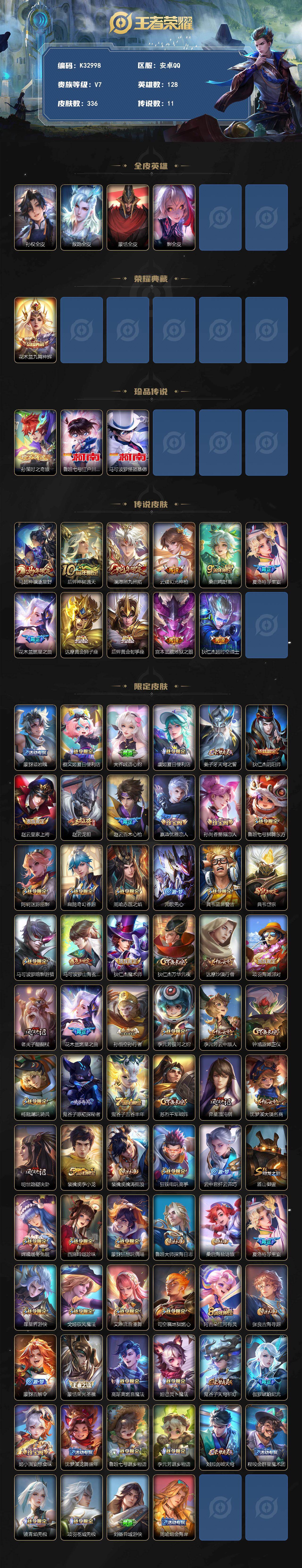 安卓Q-V7-最强王者段位-128英雄-336皮肤-1典藏皮肤-3珍品传说-11传说-81史诗
