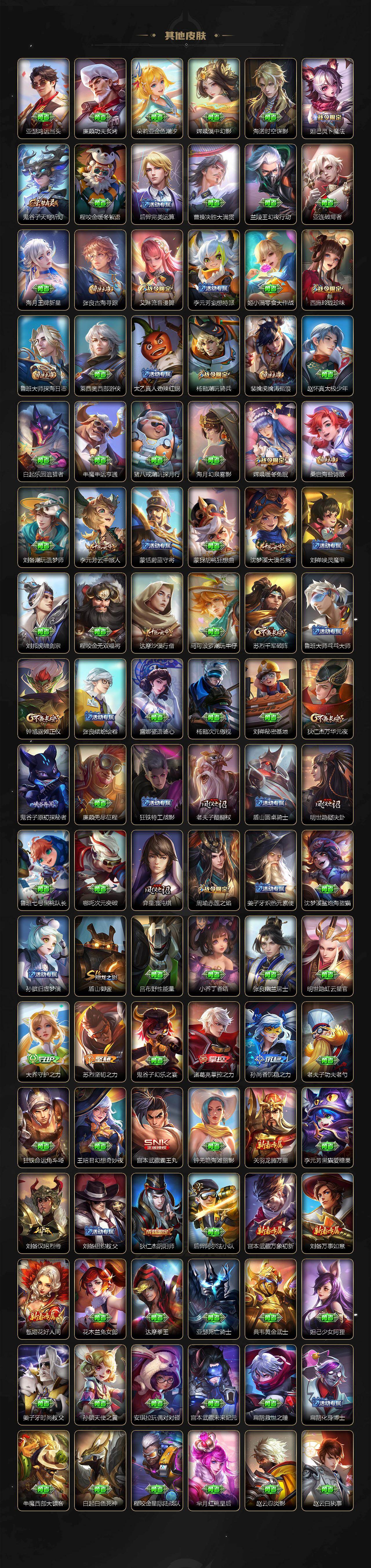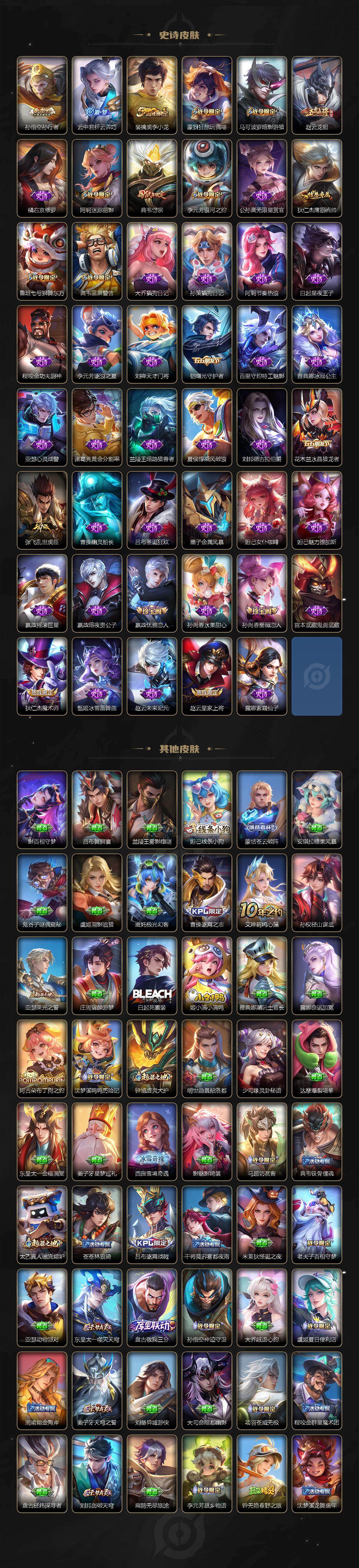 【传说皮肤】:马超神骥逐星野,后羿神树通天,澜愿照九州拓,云缨幻光神枪,桑启鸣野蒿,夏洛特浮生妄,花木兰燃星之曲,达摩黄金狮子座,后羿黄金射手座,宫本武藏地狱之眼,狄仁杰超时空战士
