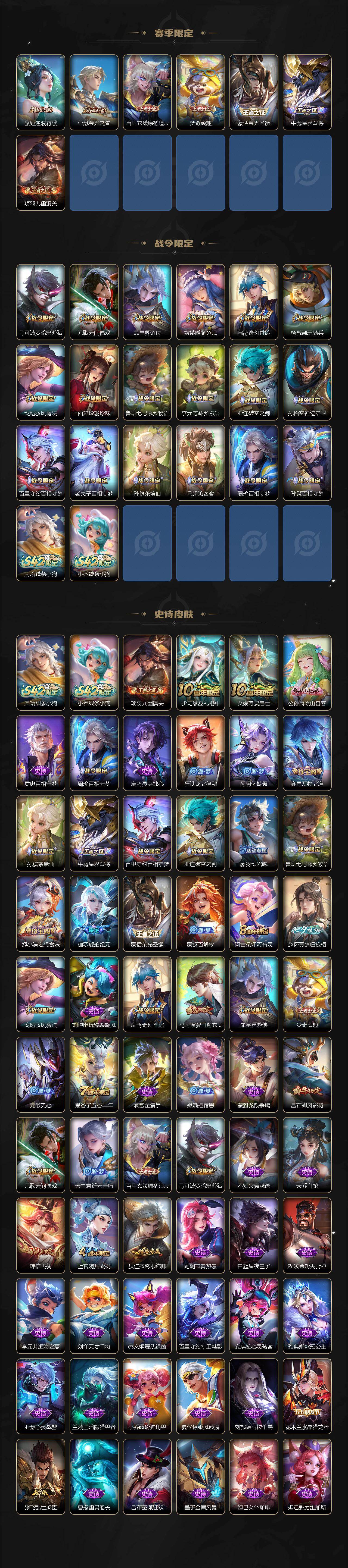 【限定皮肤】:蒙犽顽岩魄,姜子牙天穹之誓,杨戬破阵退雄兵,狄仁杰阴阳师,赵云皇家上将,高渐离玩趣恶龙,扁鹊奇幻香踪,吕布御风骁将,元歌云间偶戏,元歌无心,马可波罗暗影游猎,马可波罗山