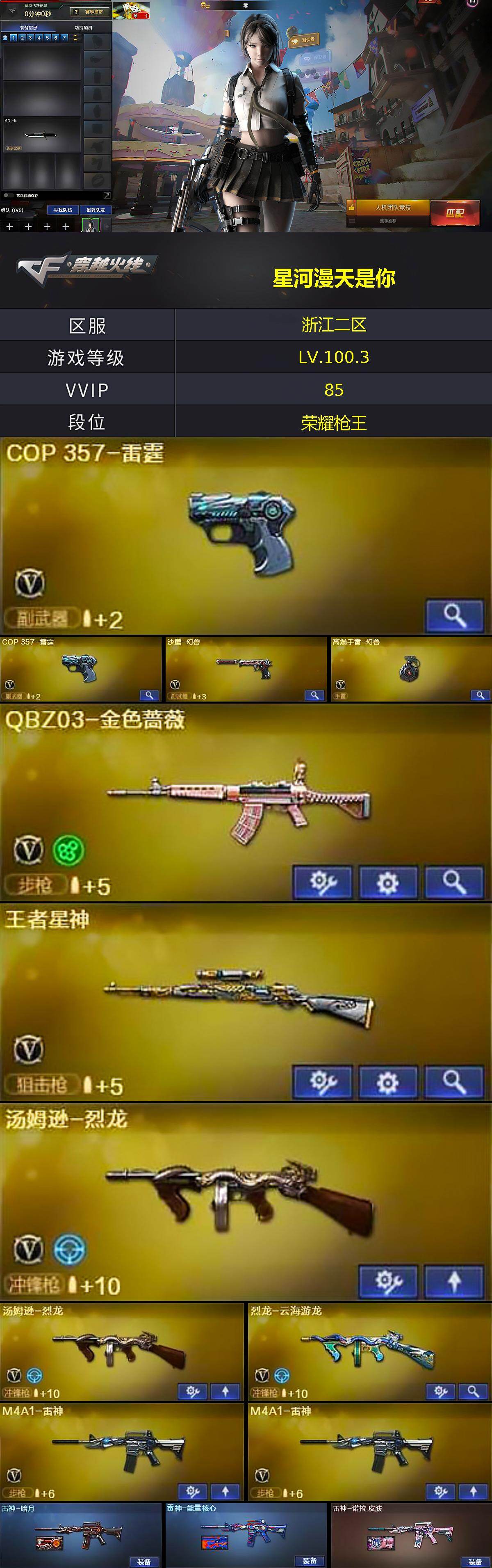 【ky4823】浙江二区-84V-3王者-4炫金【热门武器】:QBZ03-金色蔷薇,死亡之眼,金色小号,M4A1-黑骑士*2,汤姆逊-烈龙*2,加特林-炼狱*5,沙鹰-修罗,高爆手雷-幻兽【王者炫金武器】:炫金骑士,炫金千变,炫金超新星,炫金天龙【音效卡】:AK47-火麒麟音效卡,M4A1-黑骑士音效卡,Barrett-毁灭音效卡,死神-雪域霜狐-怀旧音效卡【皮肤】:雷神-暗月,雷神-能量核心,雷神-诺拉 皮肤,火麒麟-雷神,毁灭-星空,黑骑士耀金皮肤,战神-粉色甜心皮肤,战神-紫绶金章皮肤,战