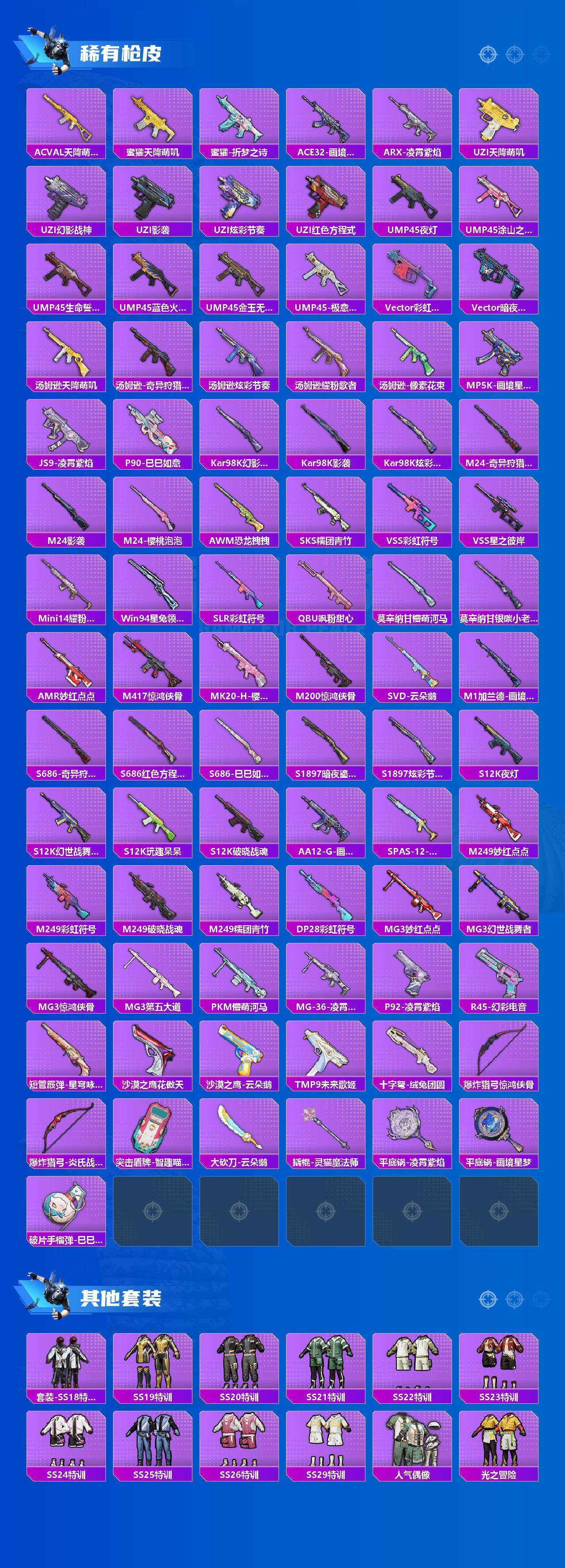 【粉色枪皮等级】:蜜獾-异瞳寒姬(七级),ACE32-萌骑漫游(四级),AKS-74U-森灵之息(五级),Kar98K-巳巳如意(五级),Mk14-福马献瑞(五级),DP-28-豹影疾电(五级)