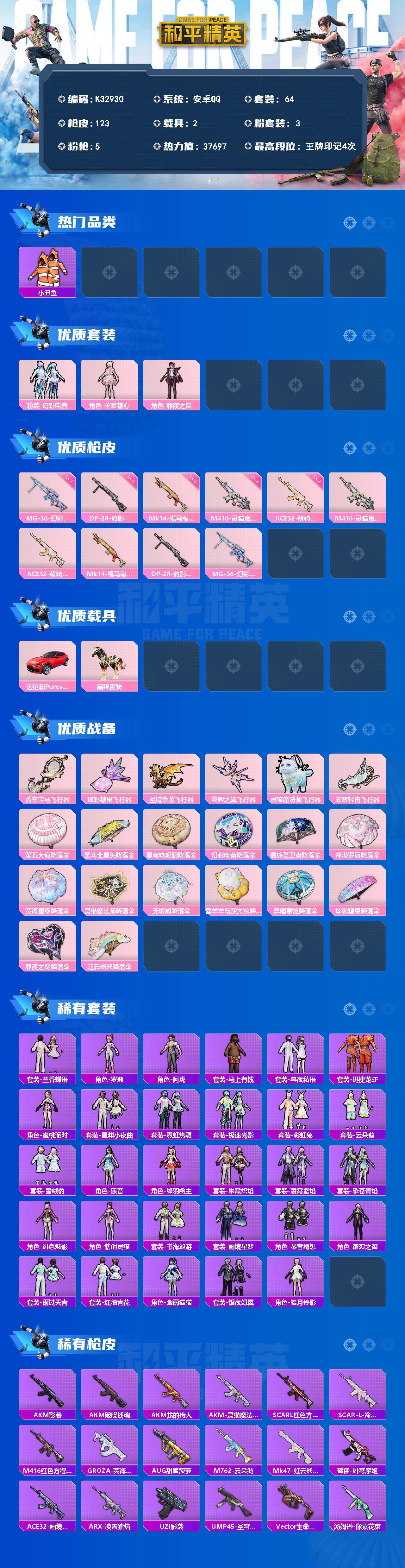 安卓 手Q-3粉装-5特效枪-2载具-7粉色飞行器-37697热力值-4王牌印记-64套装-123枪皮
