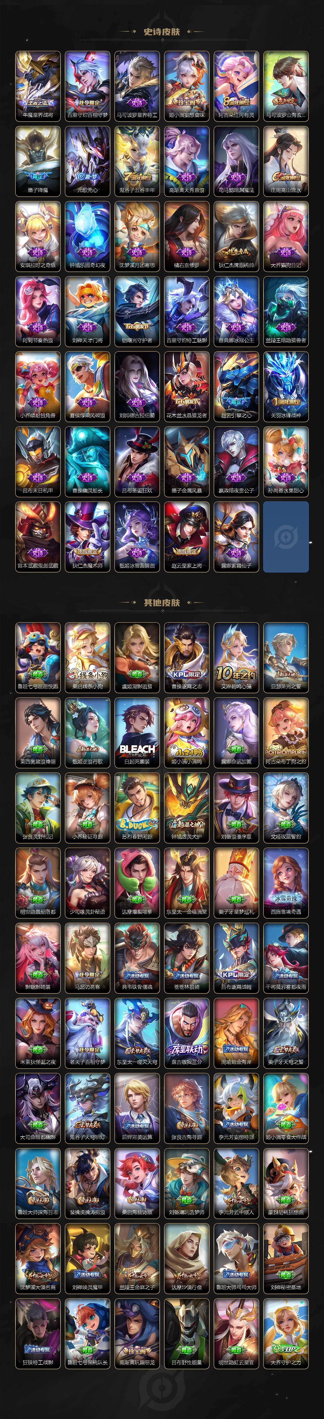 【传说皮肤】:关羽神骥镇沧海,王昭君长夜焕生,司马懿九山相柳,妲己愿照众生和,澜愿照九州拓,虞姬愿照岁时盈,桑启鸣野蒿,典韦战鼓燎原,兰陵王影龙天霄,孙尚香音你闪耀,王昭君乞巧织情,小乔音你心动,镜炽阳神光,干将莫邪久胜战神,后羿黄金射手座,宫本武藏地狱之眼,孙悟空地狱火