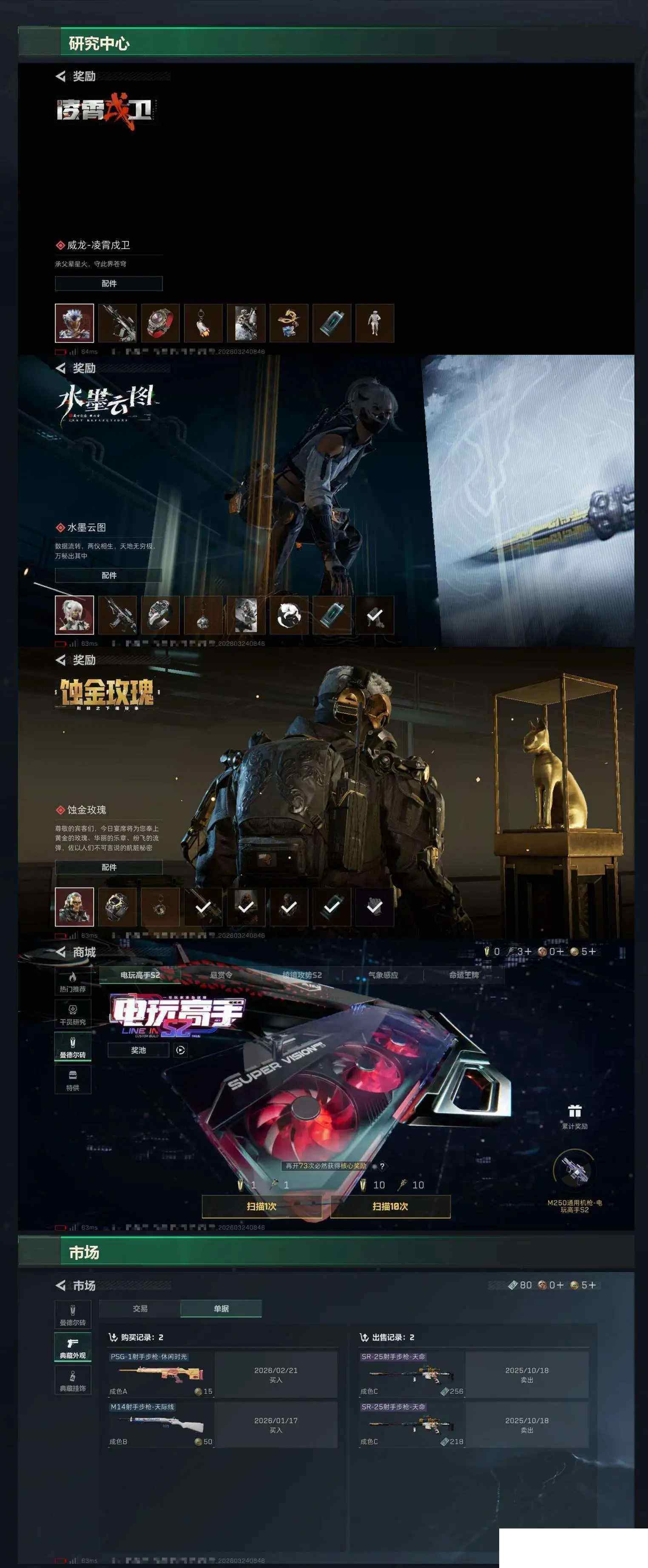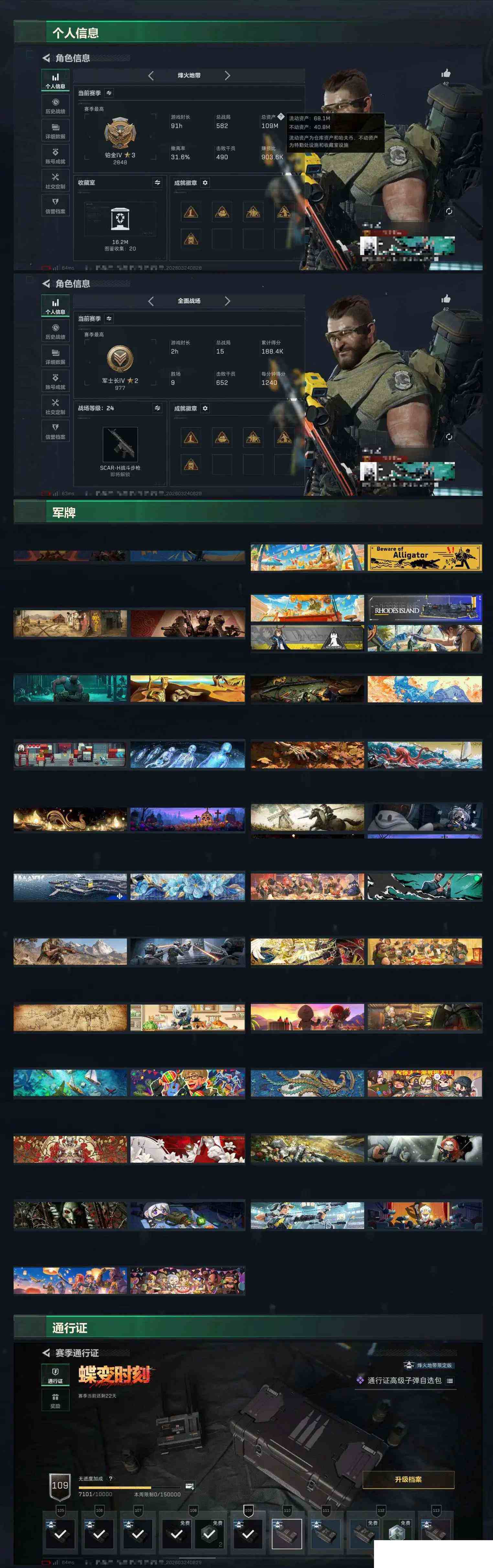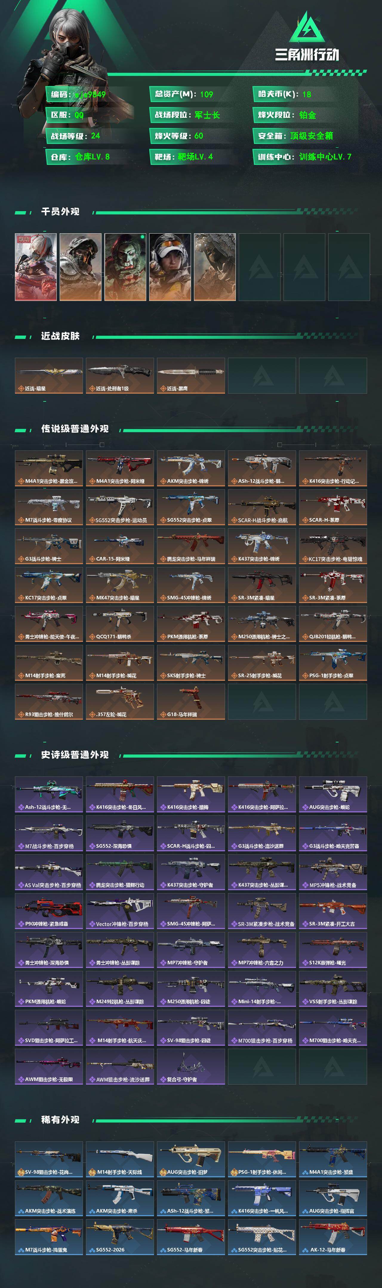 【sjs9849】包人脸 玩够能回血 一红皮 一刀皮 带赛季33 烽火地带段位: 铂金 全面战场段位: 军士长 总资产: 109000000 哈夫币: 18000 sjs9849 干员外观: 深蓝-不破誓约(S6),骇爪-维什戴尔,红狼-电锯惊魂,露娜-金牌射手(S7),乌鲁鲁-荒原猎手 传说武器皮肤: M4A1突击步枪-蚀金玫瑰,M7战斗步枪-零度协议,M4A1突击步枪-阿米娅,CAR-15突击步枪-阿米娅,勇士冲锋枪-能天使-午夜邮差,M250通用机枪-骑士之心,R93狙击步枪-维什戴尔