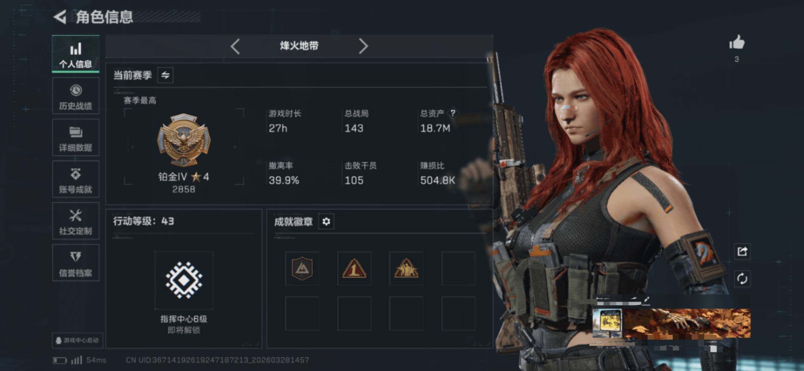 18m总资产-294k哈夫币-43烽火等级-铂金-43战场等级-校官【干员外
