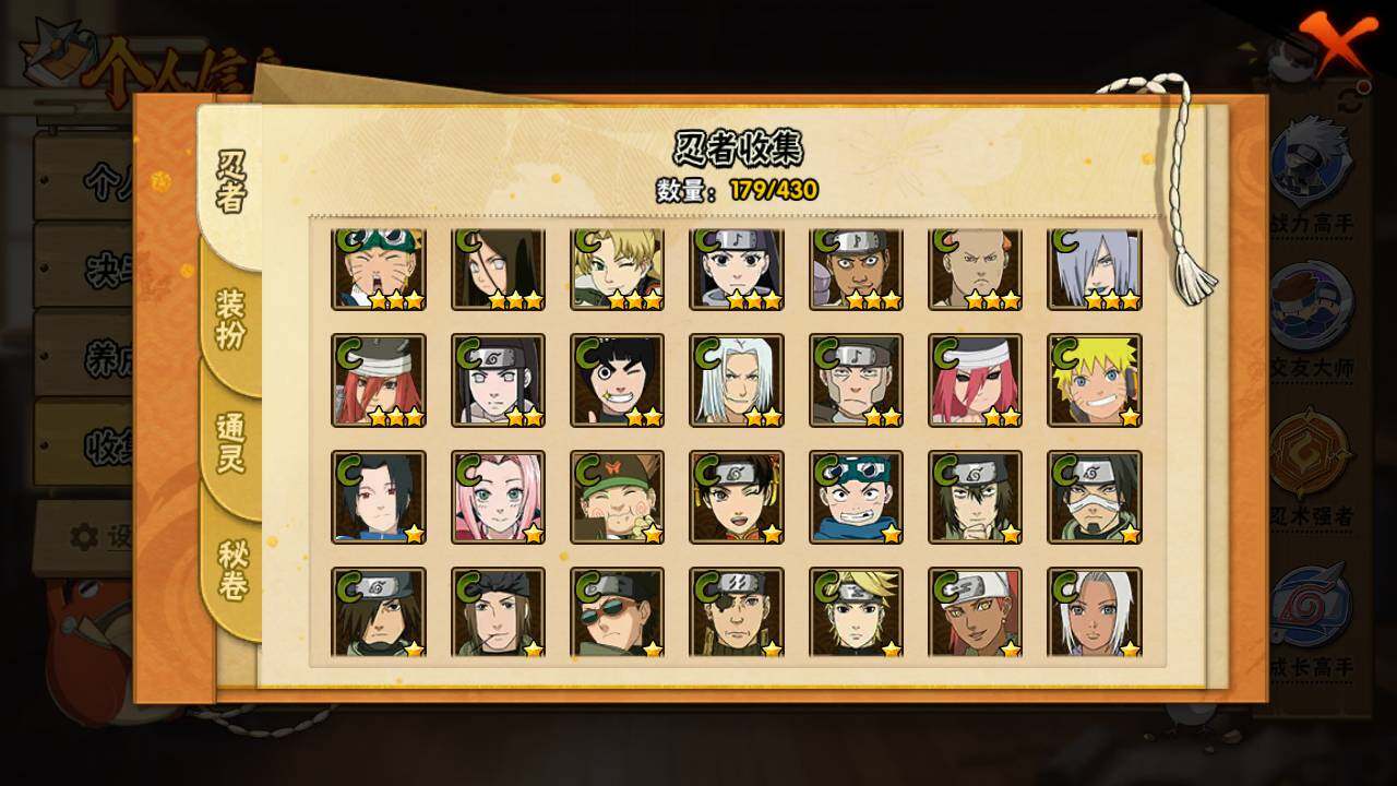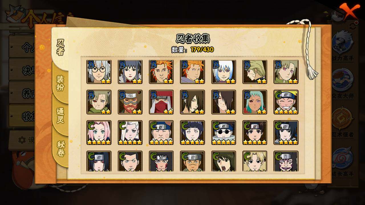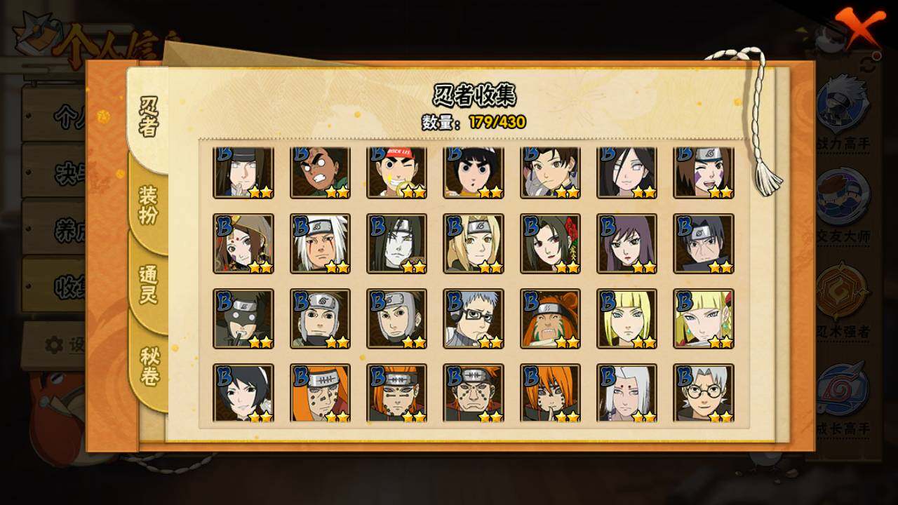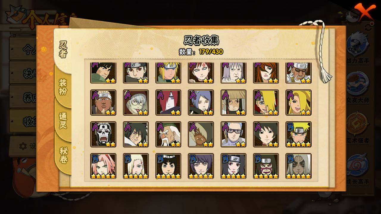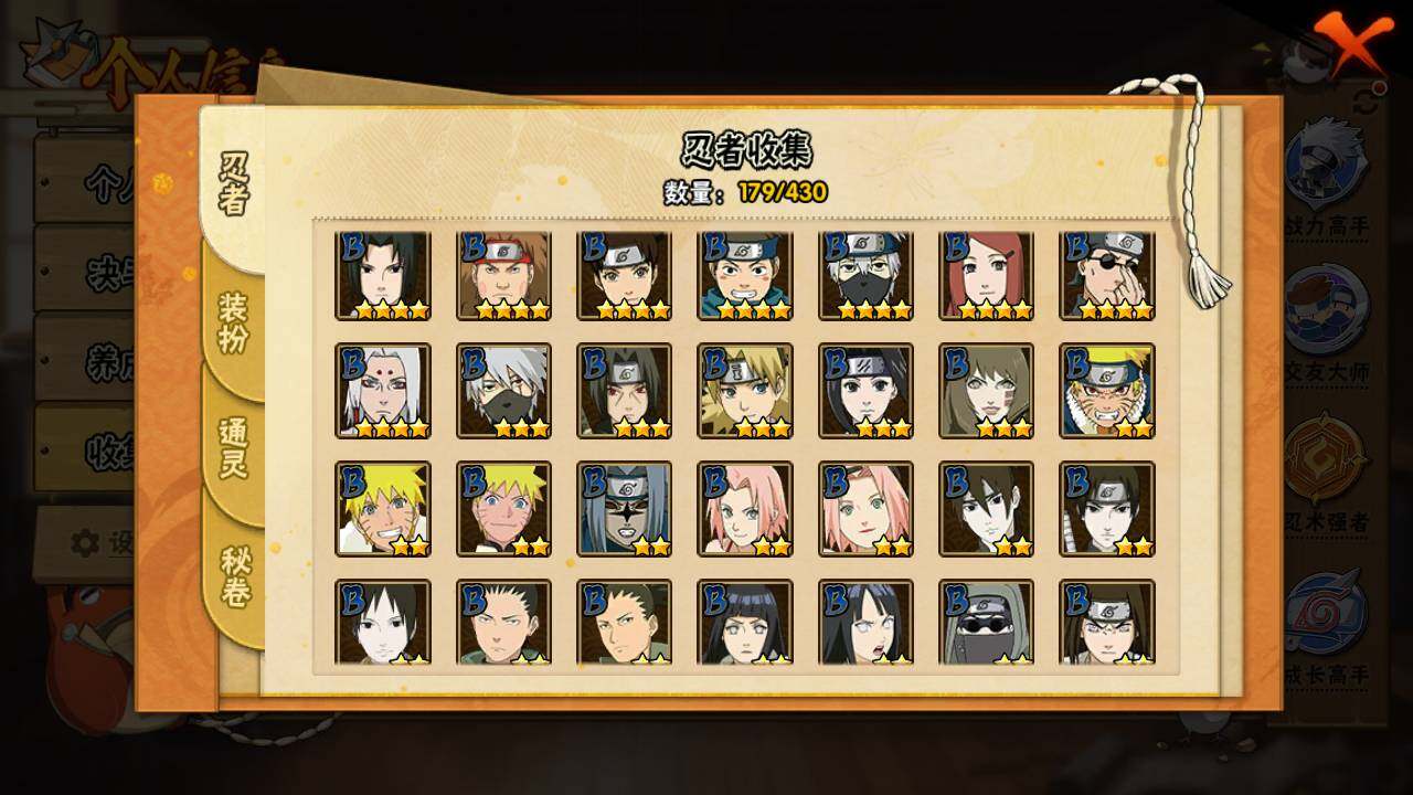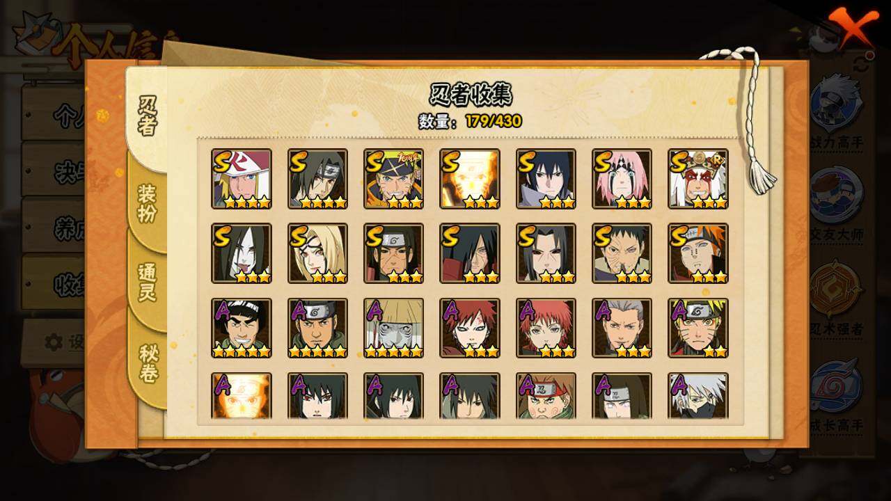 【S级忍者】:千手柱间「秽土转生」(3星),宇智波鼬「秽土转生」(3星),宇智波斑「秽土转生」(3星),春野樱「忍界大战」(3星),宇智波带土「忍界大战」(3星),宇智波鼬「须佐能乎」(4星),自来也「舞之豪杰」(3星),大蛇丸(3星),纲手「百豪」(3星),波风水门(4星),漩涡鸣人「九喇嘛连结」(3星