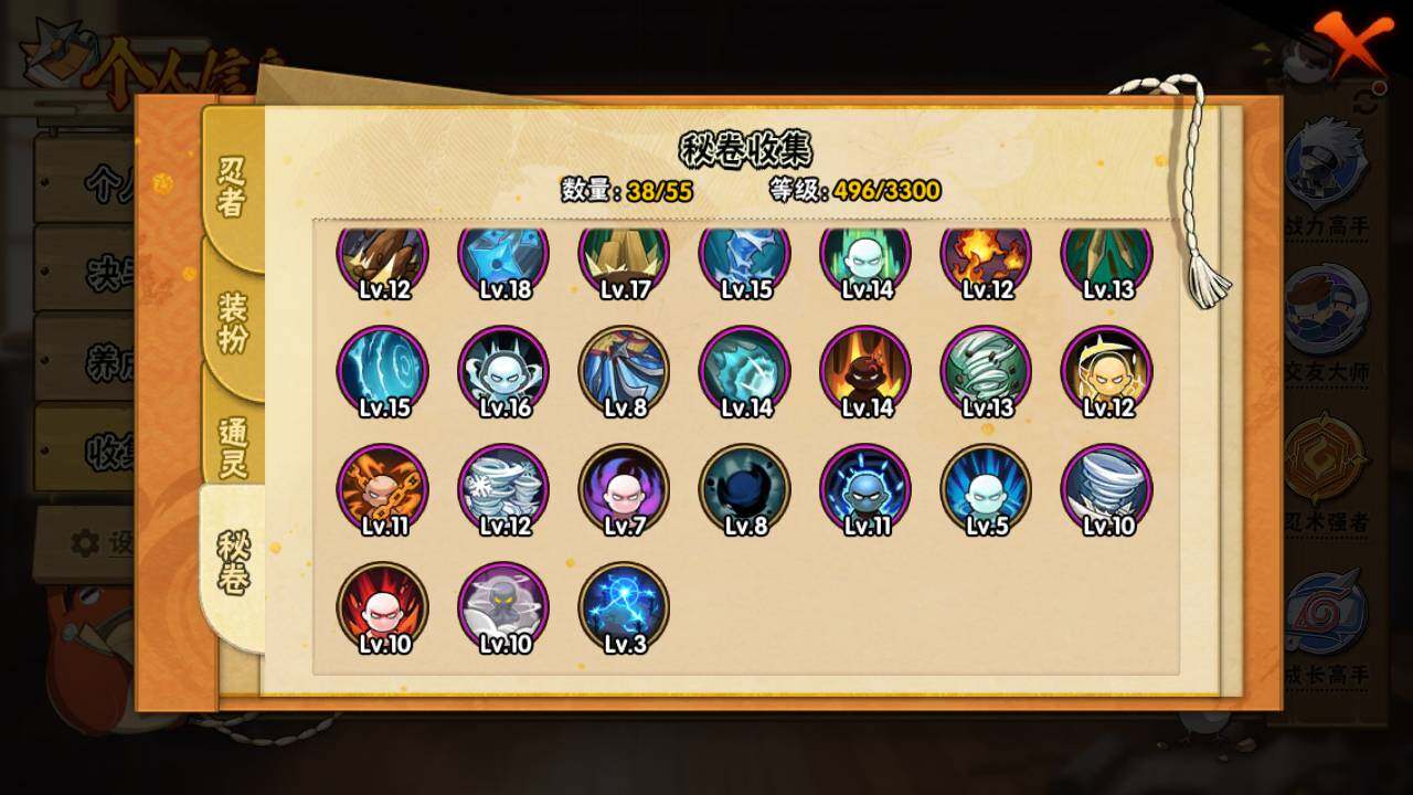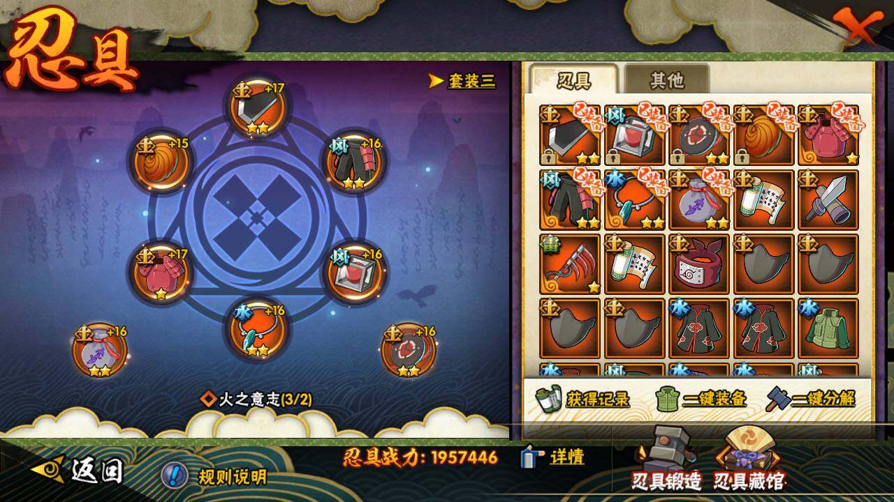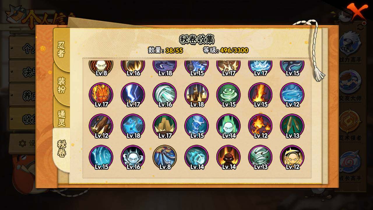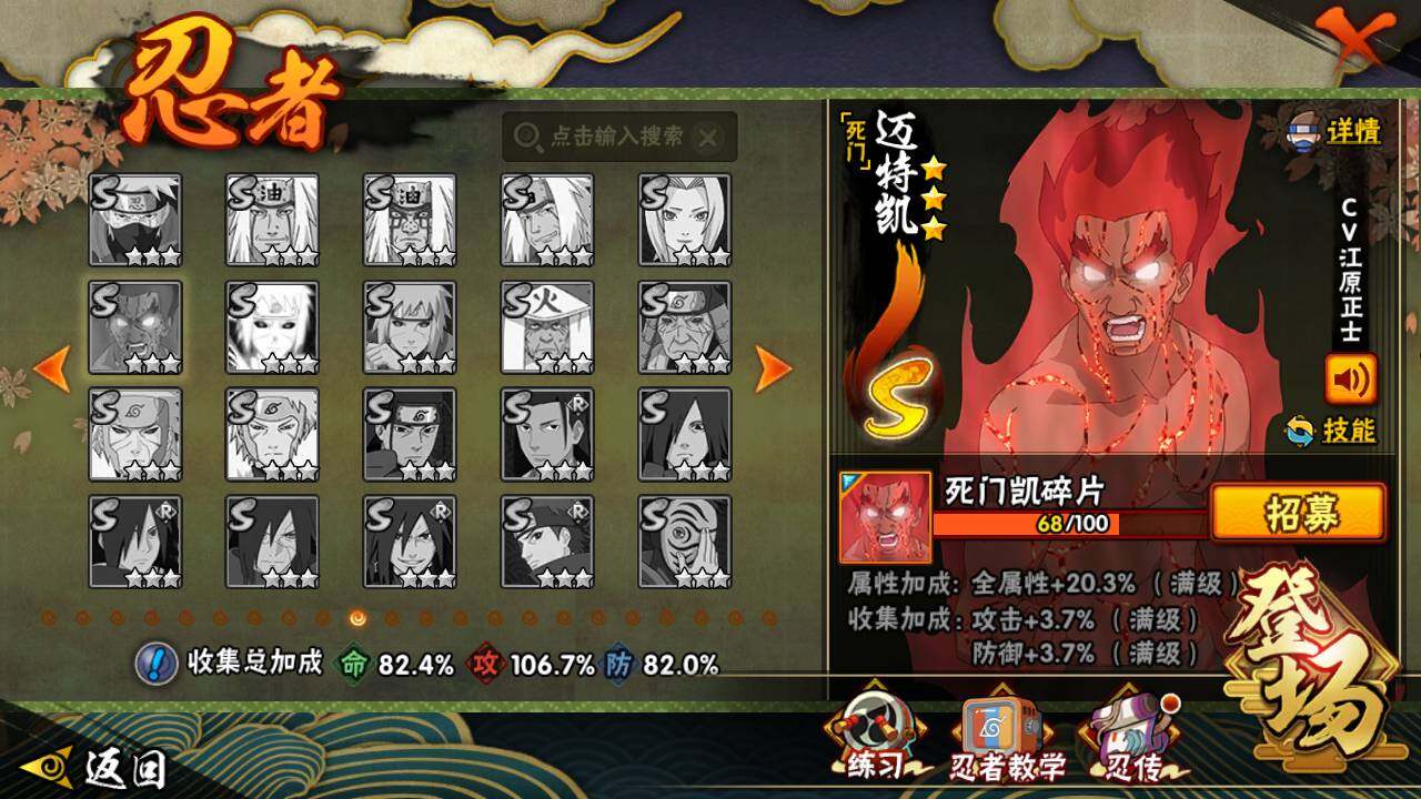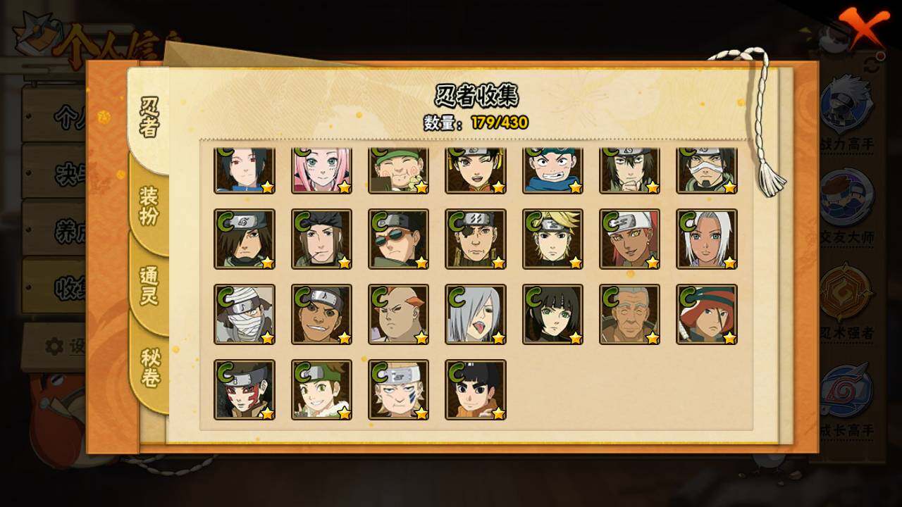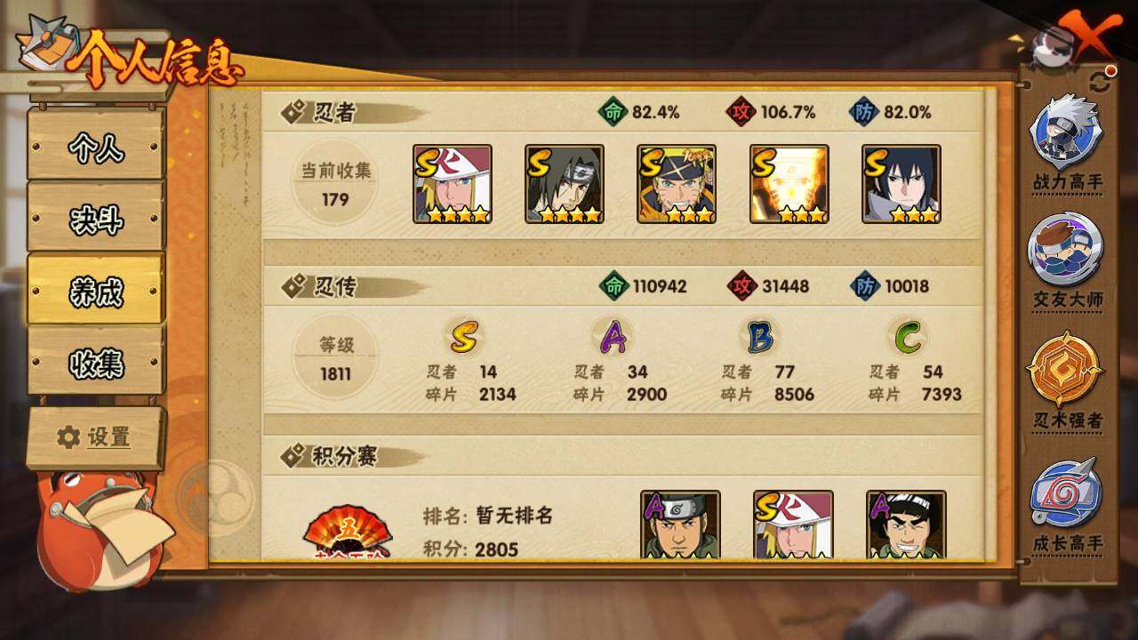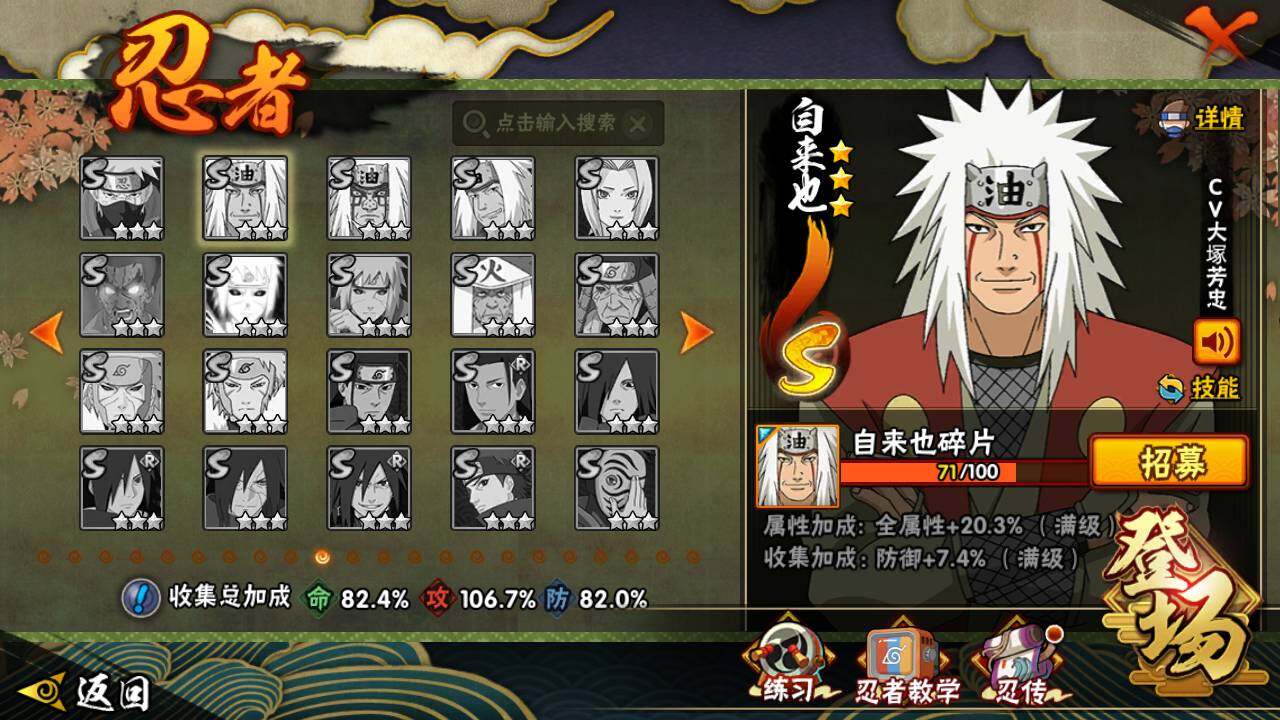 【S级忍者】:千手柱间「秽土转生」(3星),宇智波鼬「秽土转生」(3星),宇智波斑「秽土转生」(3星),春野樱「忍界大战」(3星),宇智波带土「忍界大战」(3星),宇智波鼬「须佐能乎」(4星),自来也「舞之豪杰」(3星),大蛇丸(3星),纲手「百豪」(3星),波风水门(4星),漩涡鸣人「九喇嘛连结」(3星
