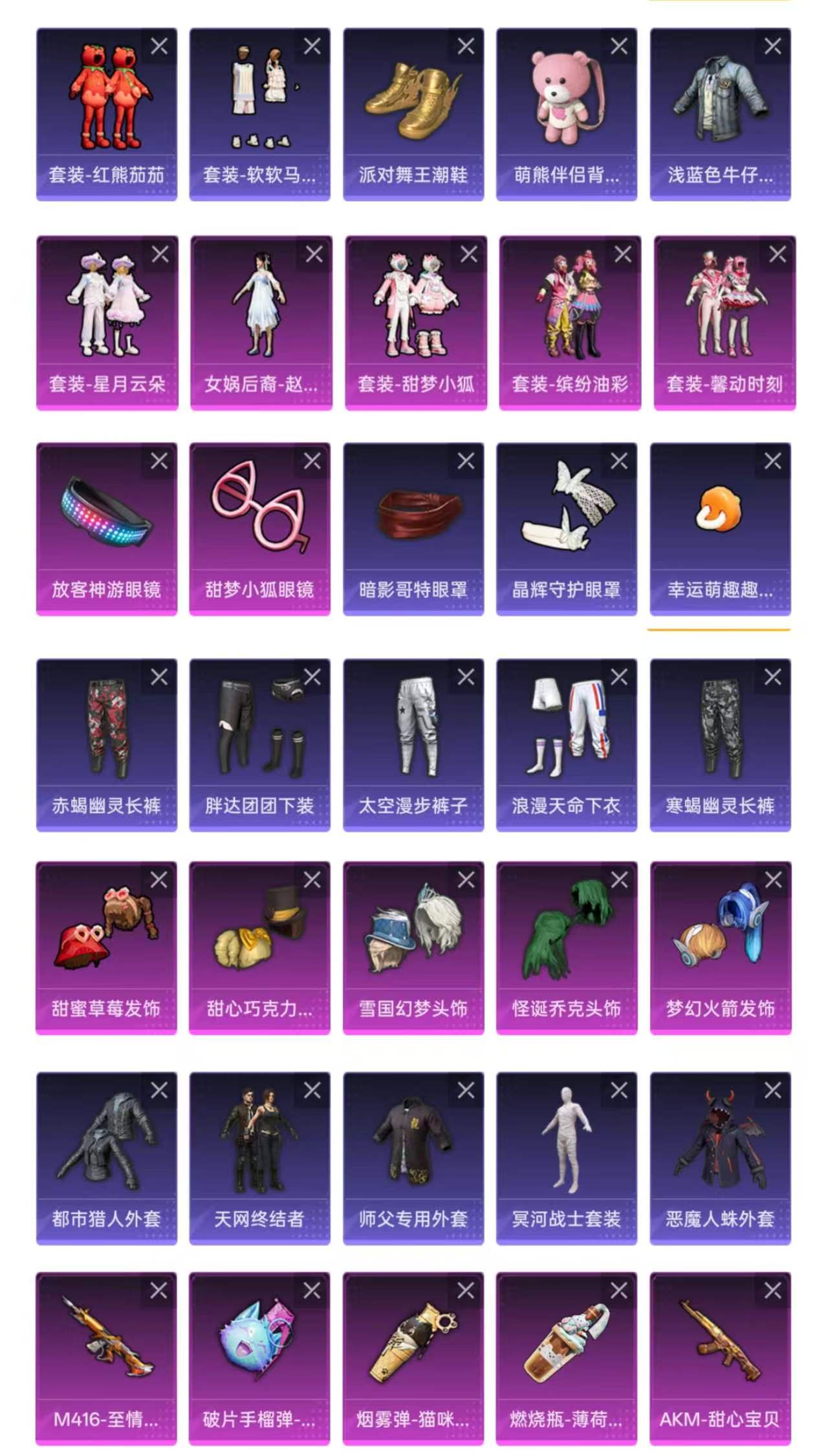 【粉色套装】:粉装-宝贝奶油派,粉装-梦幻火箭,粉装-花间之火,粉装-冰霜白皇,粉装-星之彼岸,粉装-相思残雪,角色-零号机款机体服,角色-歌者泠鸢,粉装-未来歌姬,角色-水仙星,粉装-莲影清波,粉装-繁龙极客,角色-烟云彩露,角色-千金淑猫,粉装-星穹咏叹调