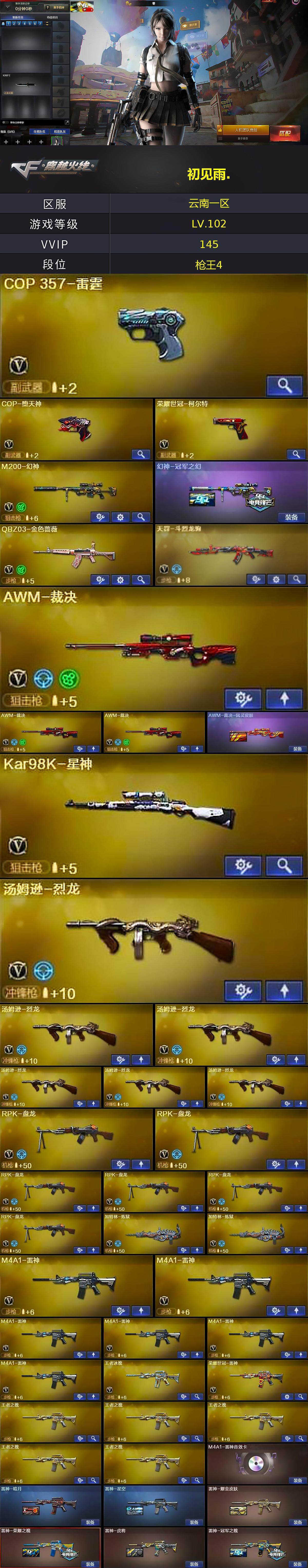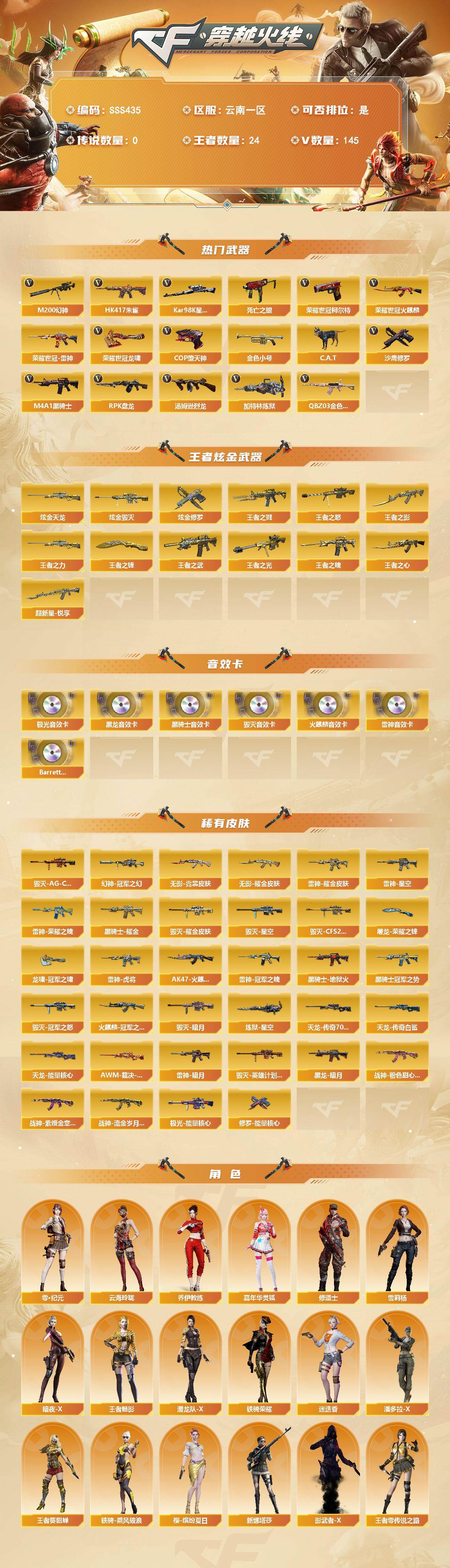 云南一区-151V-24王者武器数-5炫金武器数【热门武器】:QBZ03-金色蔷薇,HK417-朱雀,M200-幻神,死亡之眼,荣耀世冠-火麒麟,荣耀世冠-雷神,荣耀世冠-柯尔特,Kar98K-星神,金色小号,C.A.T,M4A1-黑骑士*5,汤姆逊-烈龙*6,RPK-盘龙*6,加特林-炼狱*2,COP-堕天神,沙鹰-修罗*7,荣耀世冠-龙啸【王者炫金武器】:王者之戮,超新星-悦享,王者之武,王者之影,王者之魄*5,王者之心,王者之光*2,王者之怒*3,王者之力,王者之锋*2,炫金毁灭*2,炫金