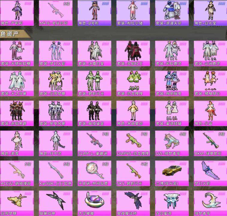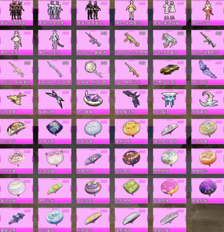 【粉色套装】:粉装-天使彩虹糖,粉装-梦幻火箭,粉装-冰霜白皇,粉装-炙焰红王,粉装-彩虹鹿灵,粉装-山涧鹿灵,粉装-天之羽翼,粉装-碧影闪光,粉装-恐龙拽拽,粉装-庄周梦蝶,粉装-绚丽摇曳,粉装-橘柚倾心,粉装-赤焰黑爵,粉装-紫电风暴,粉装-暗夜鎏金,角色-呆萌星弥