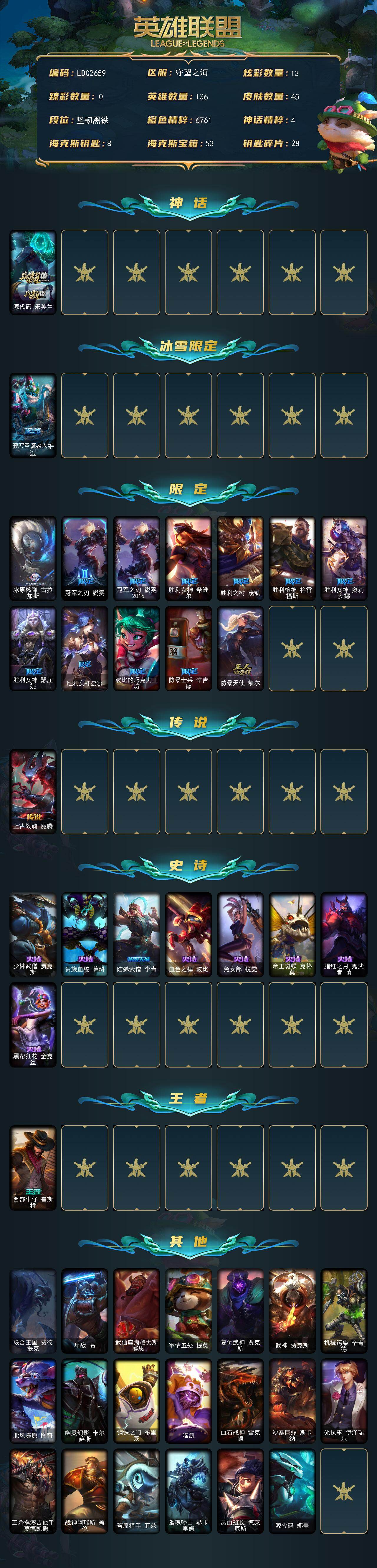 136英雄/45皮肤/1神话/14限定/13炫彩/1传说/8史诗/