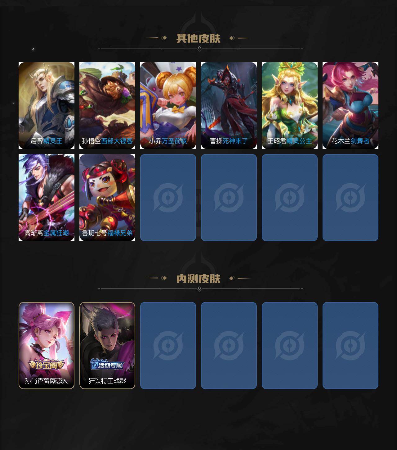【限定皮肤】:狄仁杰阴阳师,赵云皇家上将,孙尚香蔷薇恋人,庄周高山流水,芈月重明,元歌云间偶戏,马可波罗暗影游猎,狄仁杰魔术师,狄仁杰万华元夜,达摩星际陆战队,达摩沙漠行僧,项羽海滩派对,老夫子醍醐杖,程咬金演武夺筹,兰陵王金庭之子,亚瑟潮玩骑士王