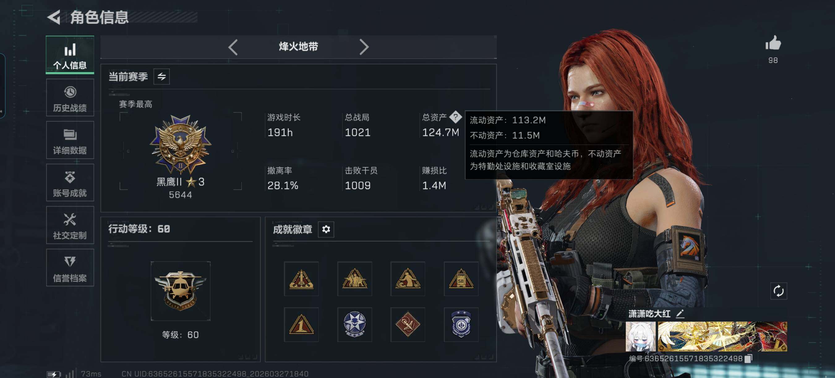 124m总资产-166k哈夫币-60烽火等级-黑鹰-19战场等级-列兵【干员
