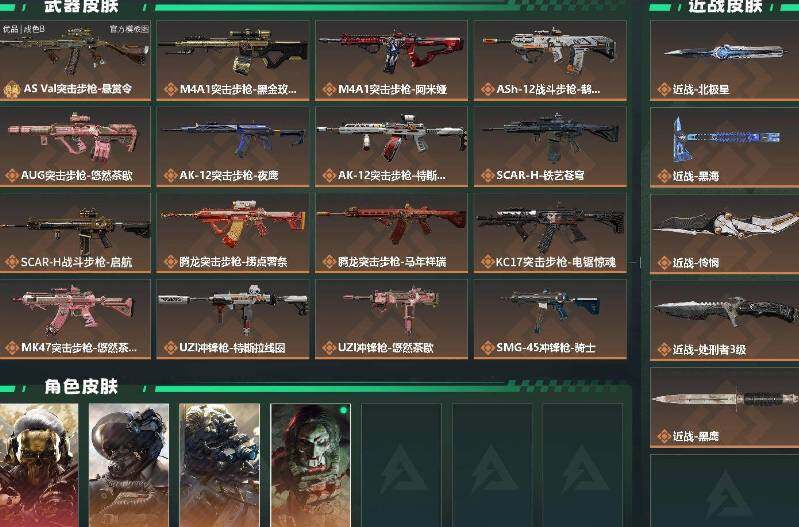 【近战皮肤】:近战-北极星,近战-黑海,近战-怜悯,近战-处刑者3级,近战-黑鹰