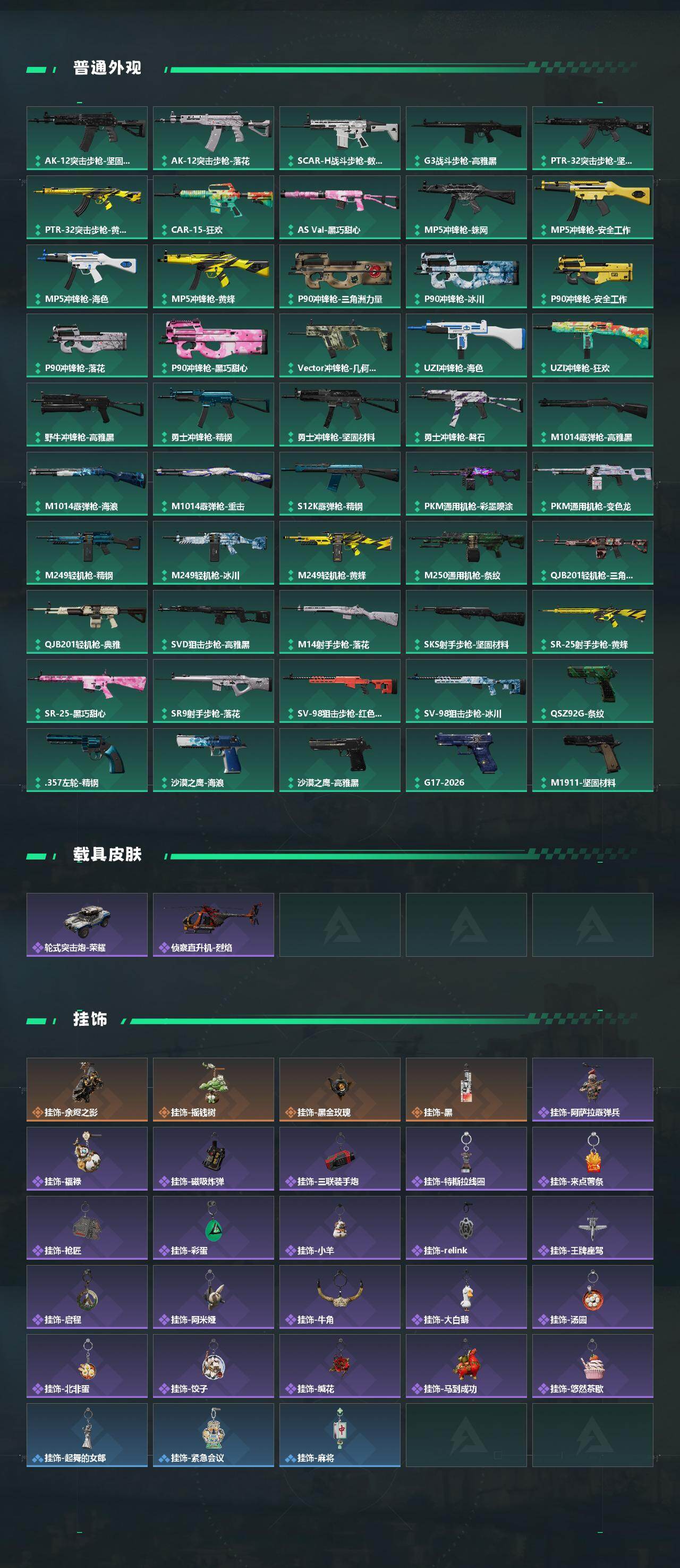 【传说外观】:M4A1突击步枪-蚀金玫瑰,M4A1突击步枪-阿米娅,ASh-12战斗步枪-鹅鸭杀,AUG