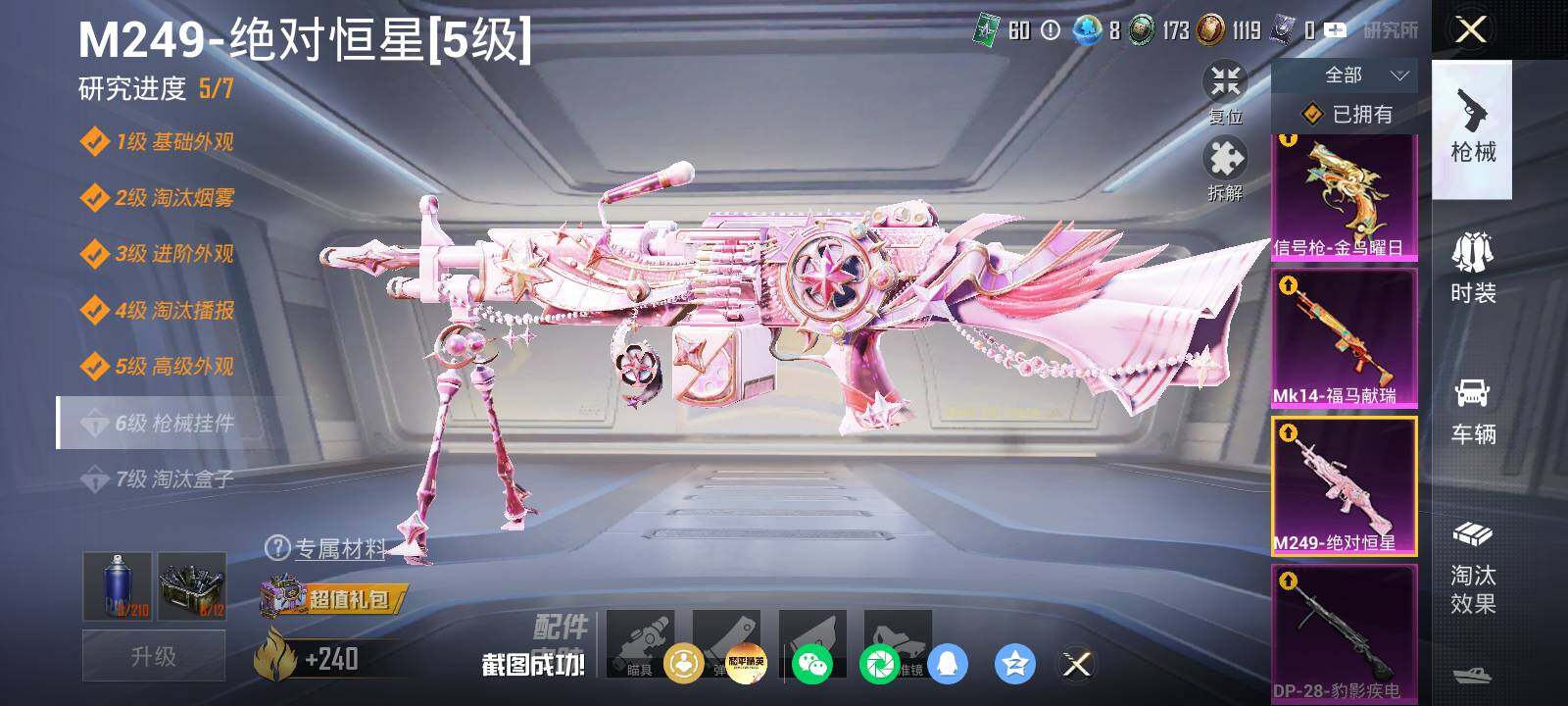 【粉色枪皮等级】:Mk14-福马献瑞(五级),M249-绝对恒星(五级),DP-28-豹影疾电(四级),信号枪-金乌曜日(二级)