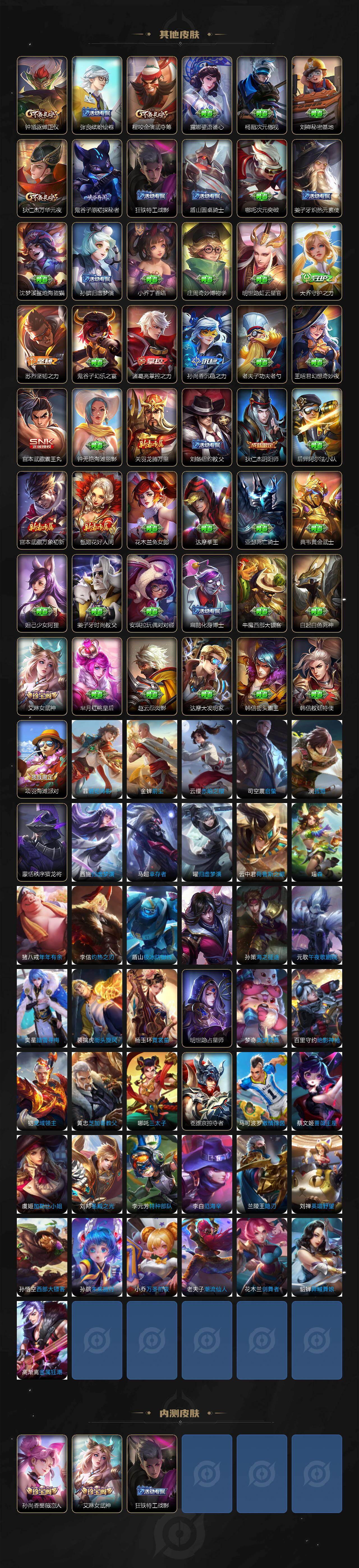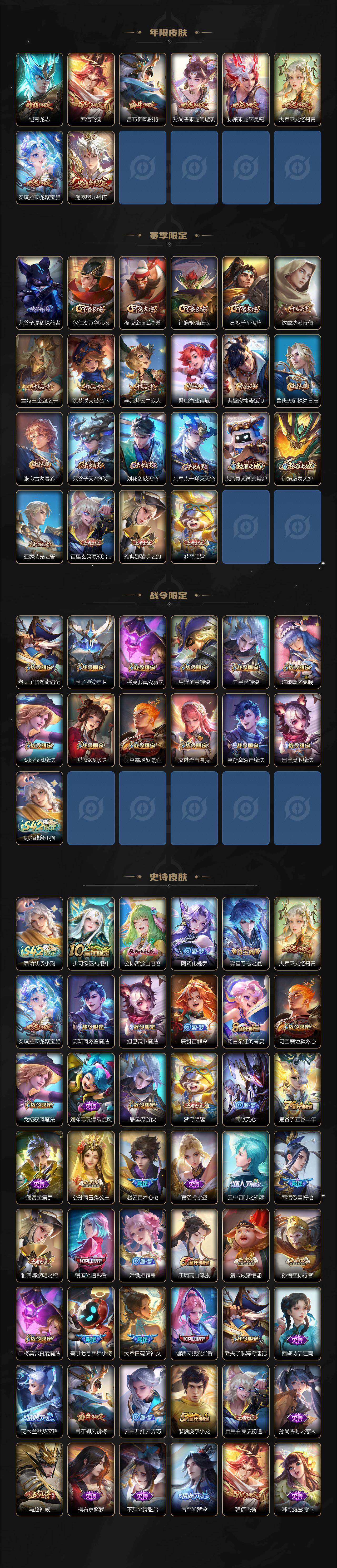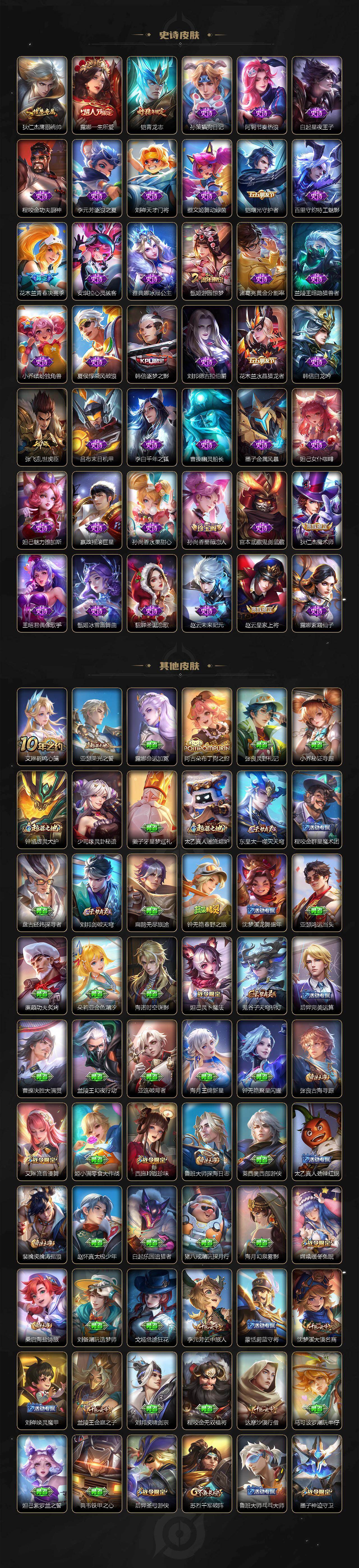 【限定皮肤】:狄仁杰阴阳师,赵云皇家上将,赵云百木心枪,墨子神迹守卫,孙尚香蔷薇恋人,孙尚香异界灵契,鲁班七号乒乒小将,庄周高山流水,吕布御风骁将,元歌