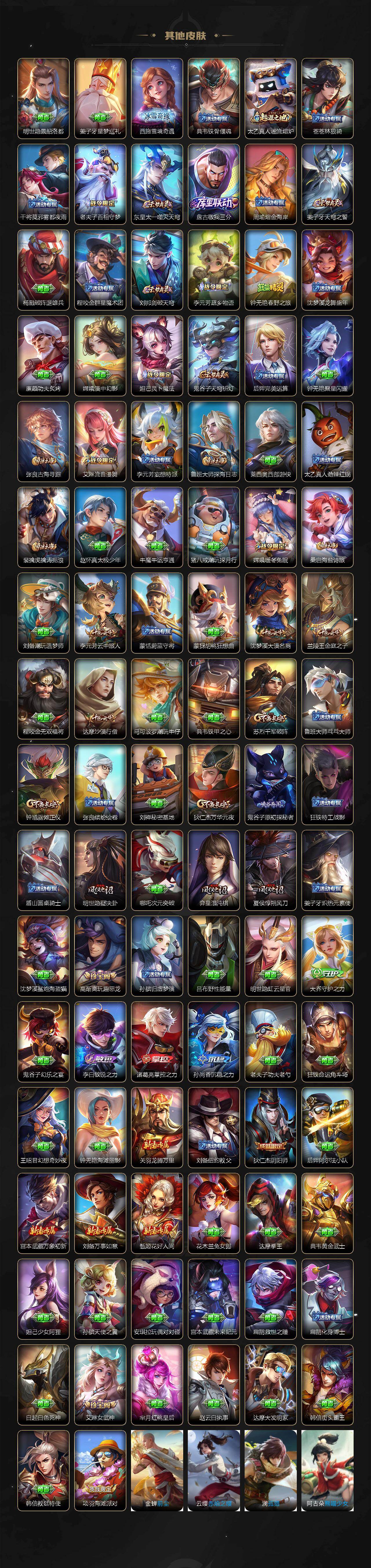 【限定皮肤】:蒙犽顽岩魄,姜子牙天穹之誓,杨戬破阵退雄兵,狄仁杰阴阳师,赵云皇家上将,孙尚香蔷薇恋人,高渐离玩趣恶龙,阿轲迷踪丽影,