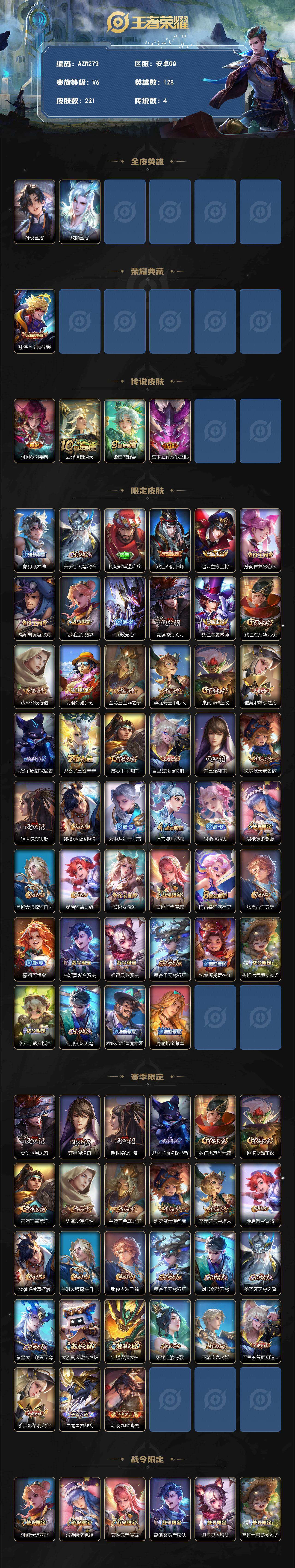 安卓Q-V6-最强王者段位-128英雄-221皮肤-1典藏皮肤-4传说-64史诗