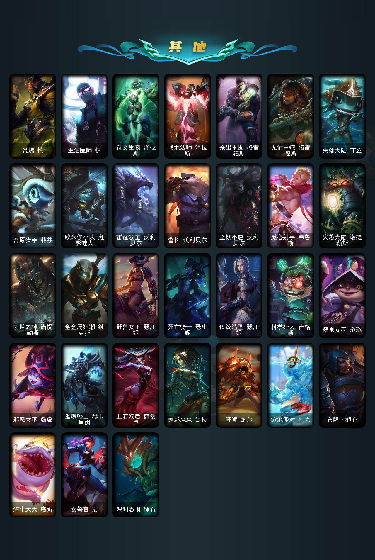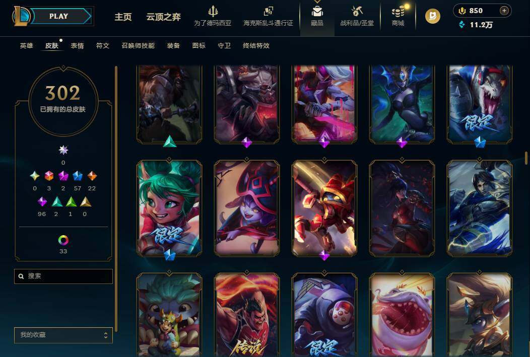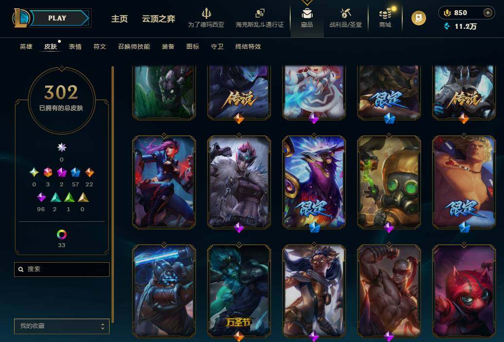 169英雄/302皮肤/3终极/2神话/57限定/2臻彩/37炫