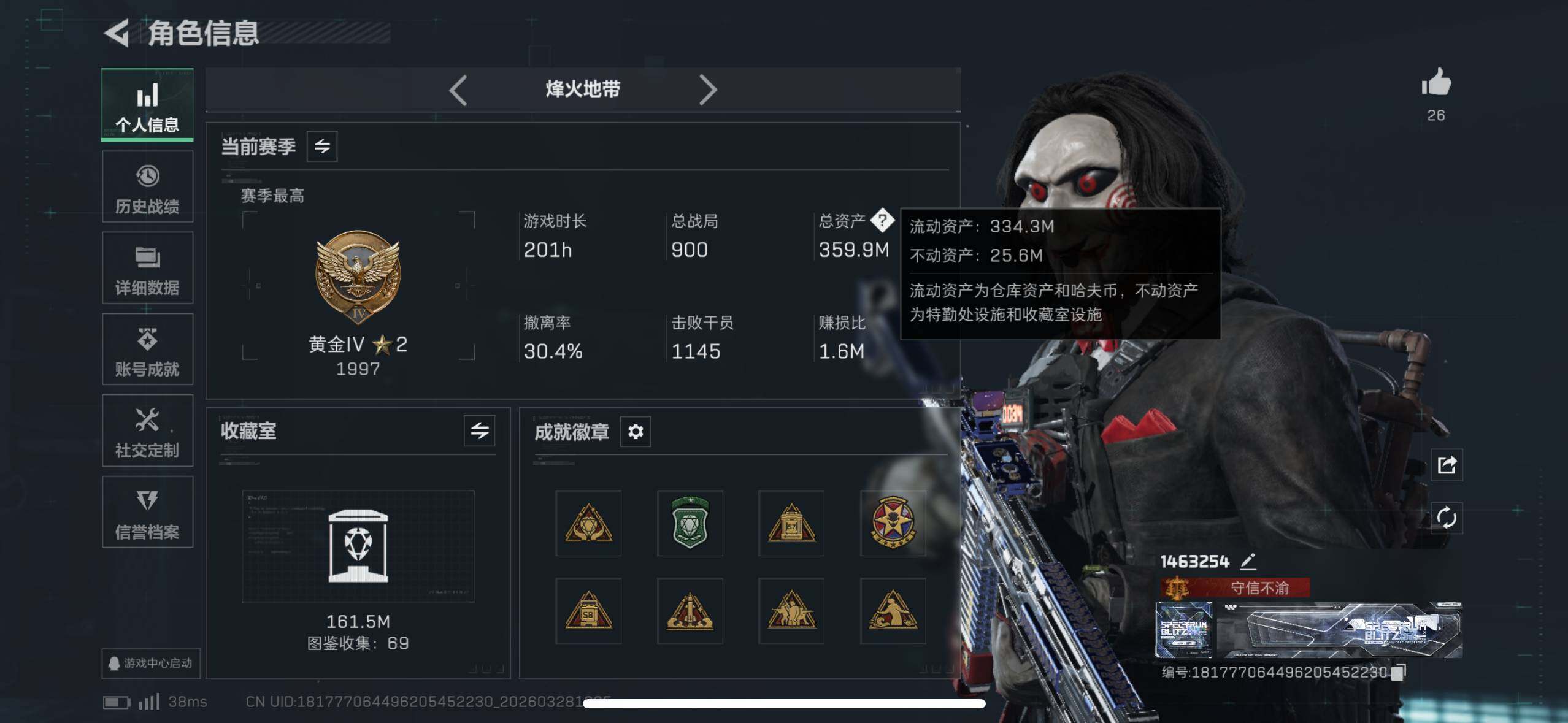 359m总资产-30580k哈夫币-60烽火等级-黄金-11战场等级-列兵