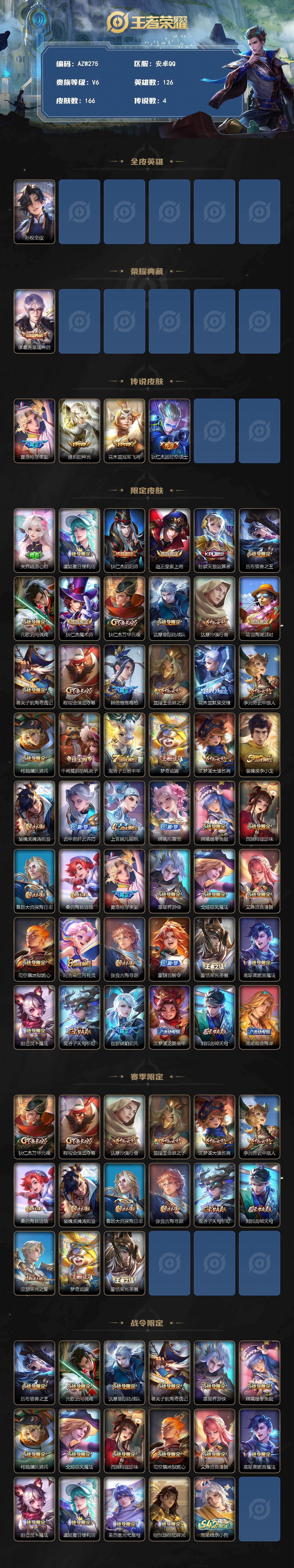 安卓Q-V6-最强王者段位-126英雄-166皮肤-1典藏皮肤-4传说-40史诗
