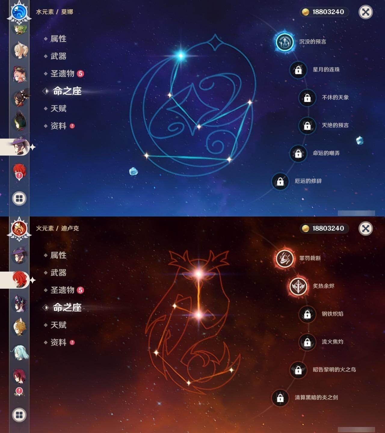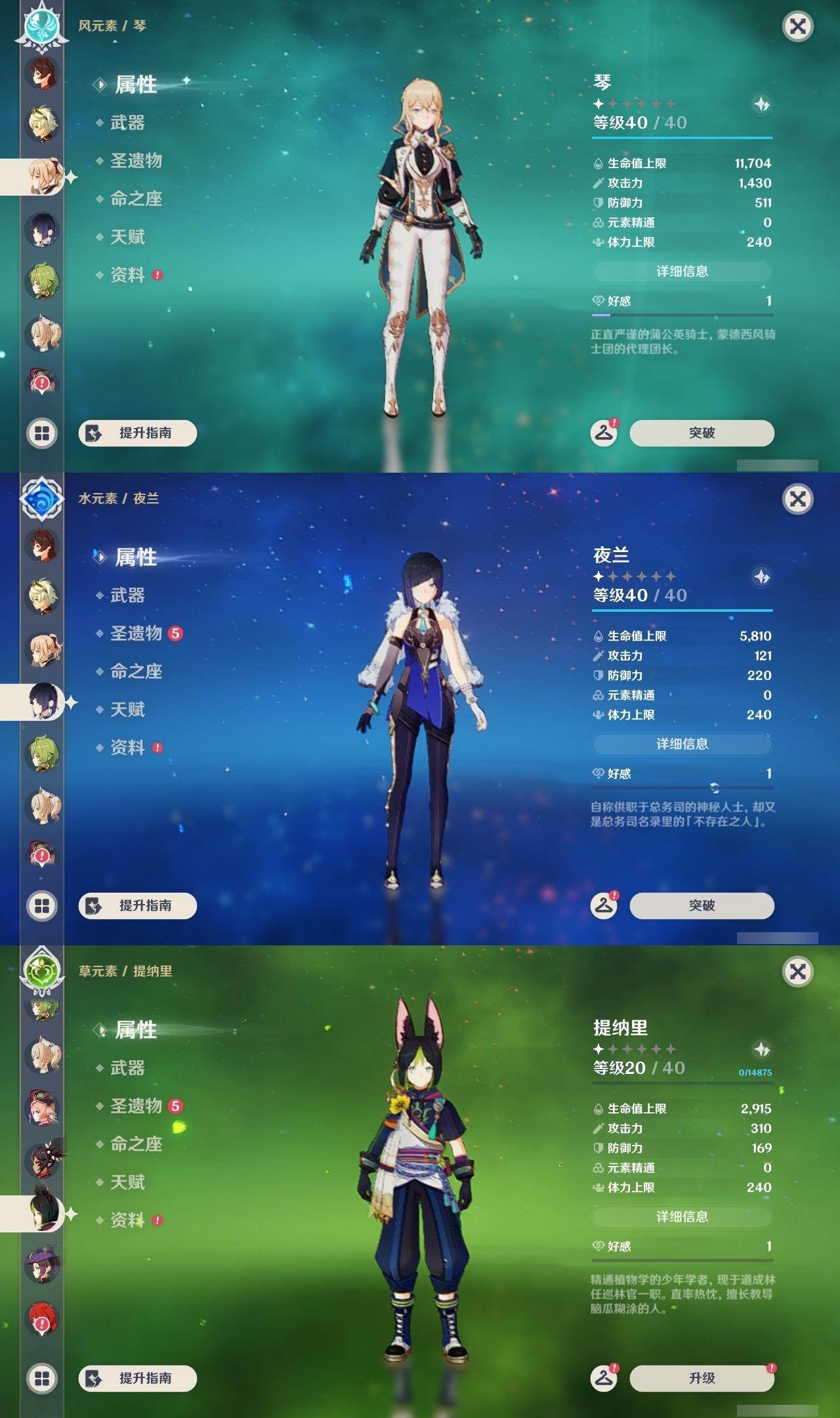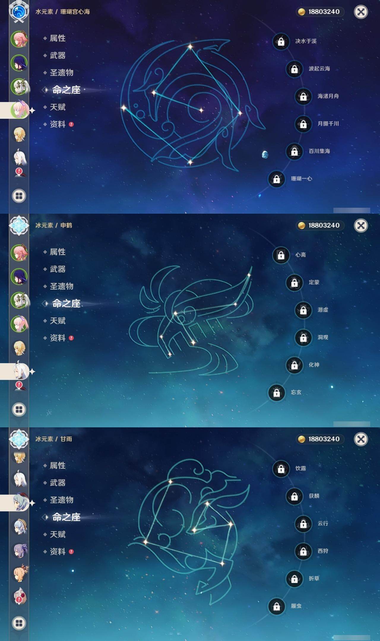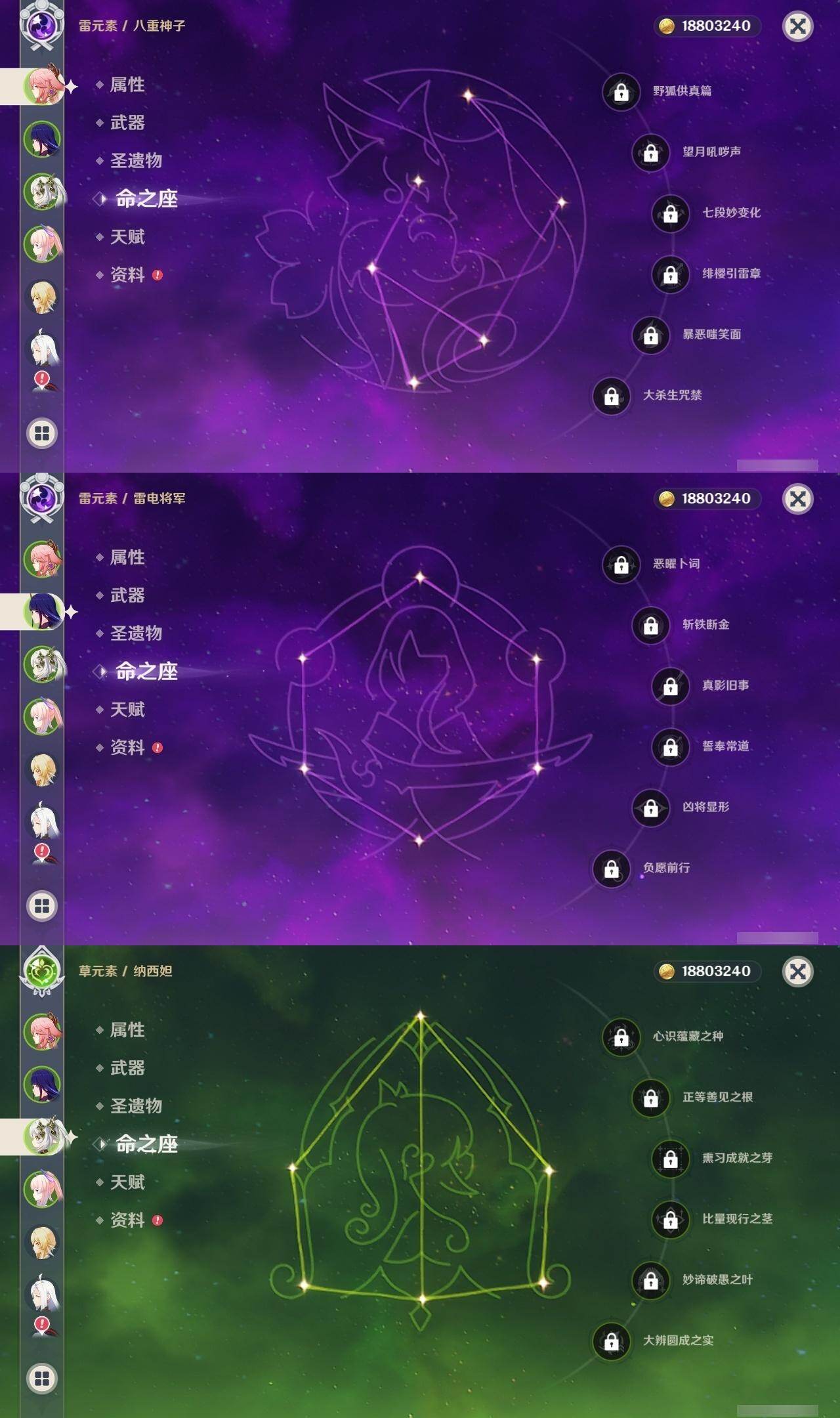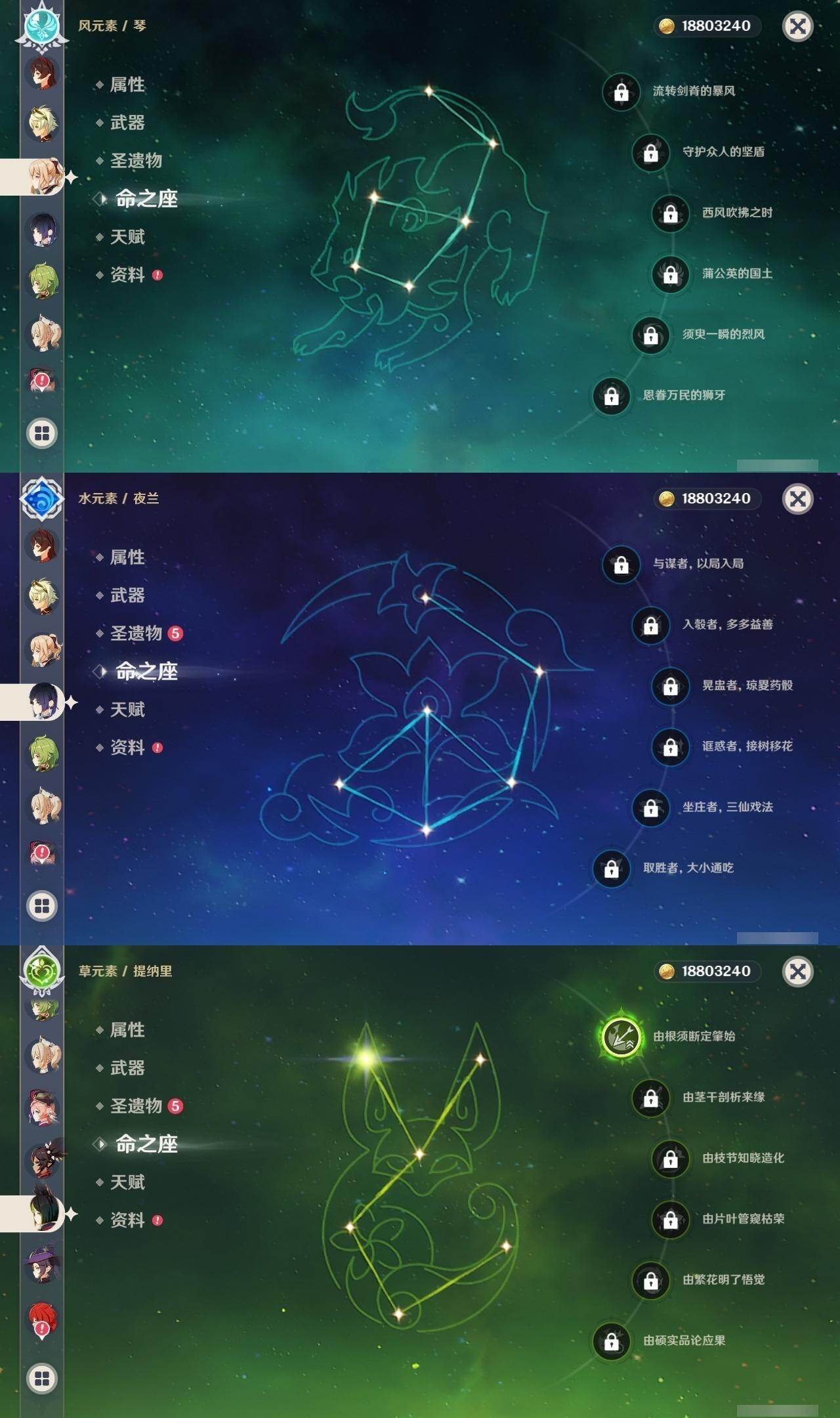 0命纳西妲,1命提纳里,0命夜兰,0命八重神子,0命申鹤,0命雷电将军,0命神里绫华,0命甘雨,0命宵宫,0命珊瑚宫心海,0命刻晴,0命琴,1命莫娜,2命迪卢克,精1波乱月白经津,精1神乐之真意,精1息灾,精1赤角石溃杵,精1薙草之稻光,精1飞雷之弦振,精1和璞鸢