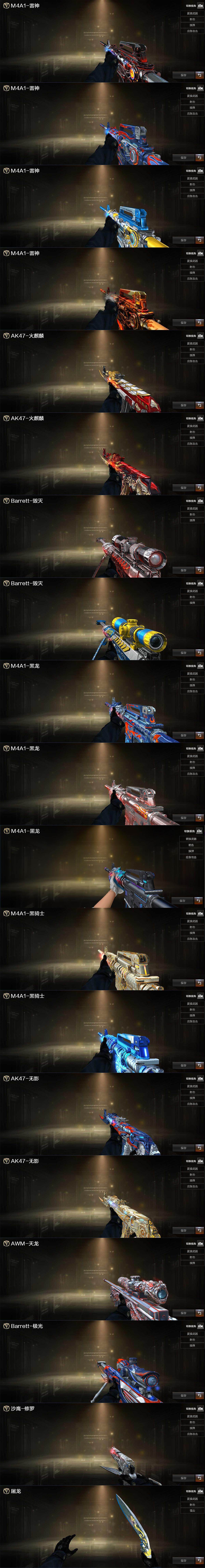 【热门武器】:QBZ03-金色蔷薇*2,M4A1-黑骑士*2,汤姆逊-烈龙*6,RPK-盘龙*5,加特林-炼狱,沙鹰-修罗*3