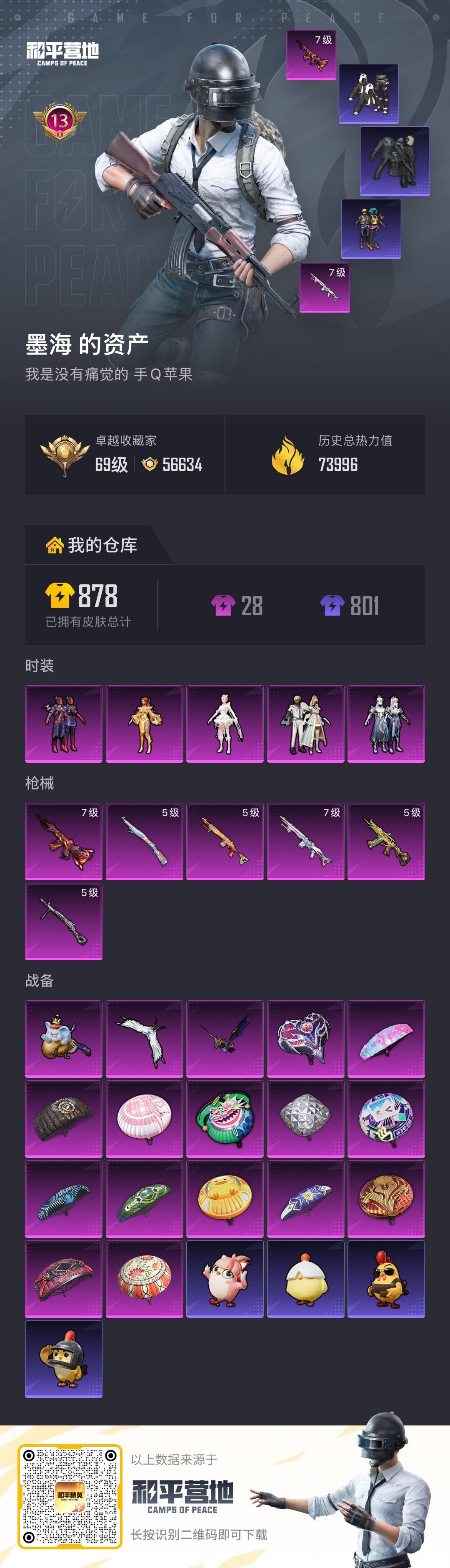 苹果 手Q-5粉装-6特效枪-0载具-3粉色飞行器-73996热力值-13王牌印记-190套装-231枪皮