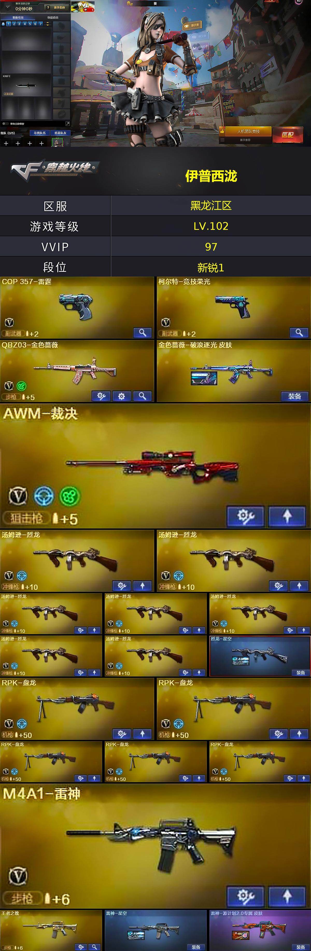 【热门武器】:QBZ03-金色蔷薇,死亡之眼,M4A1-黑骑士*2,汤姆逊-烈龙*7,RPK-盘龙*5,加特林-炼狱*3,沙鹰-修罗
