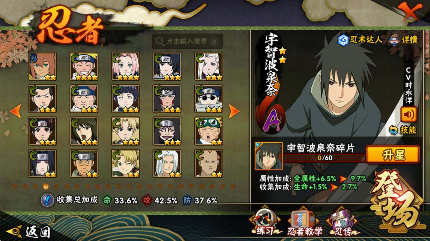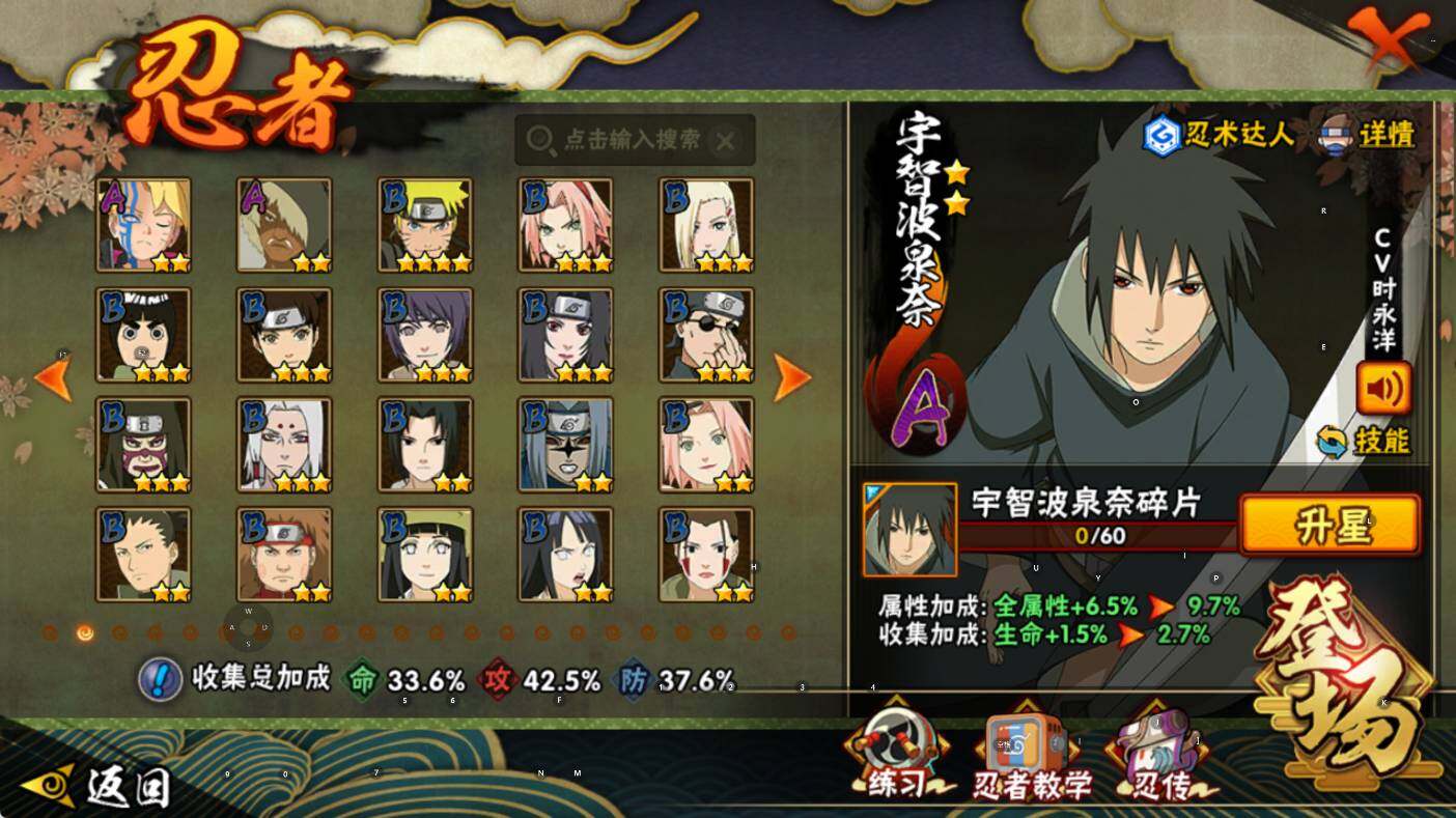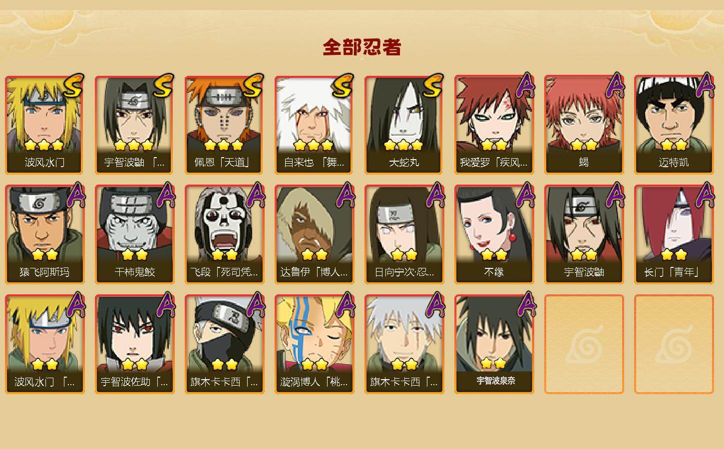 【S级忍者】:宇智波鼬「须佐能乎」(3星),自来也「舞之豪杰」(3星),大蛇丸(3星),波风水门(3星),佩恩「天道」(3星)