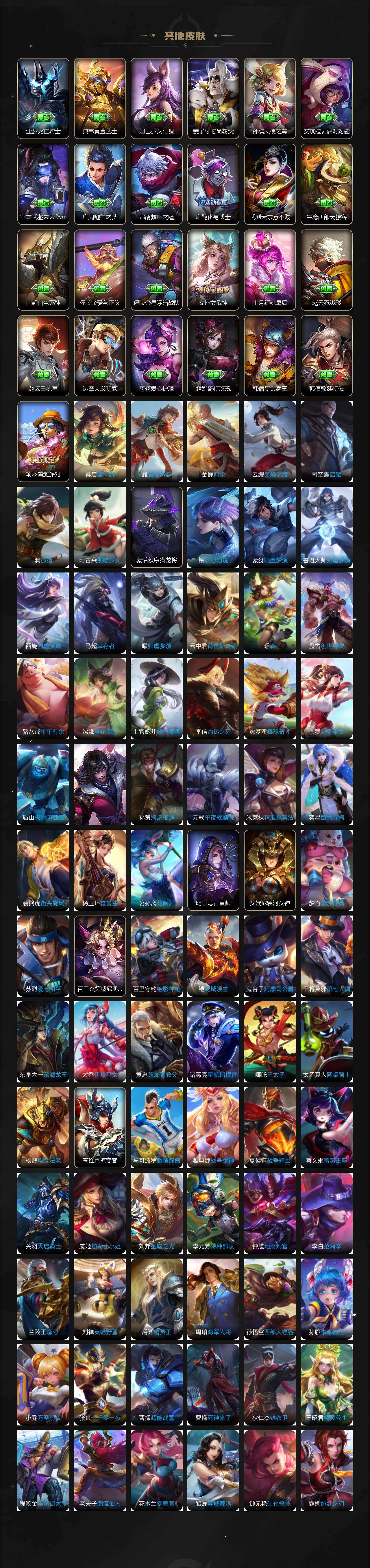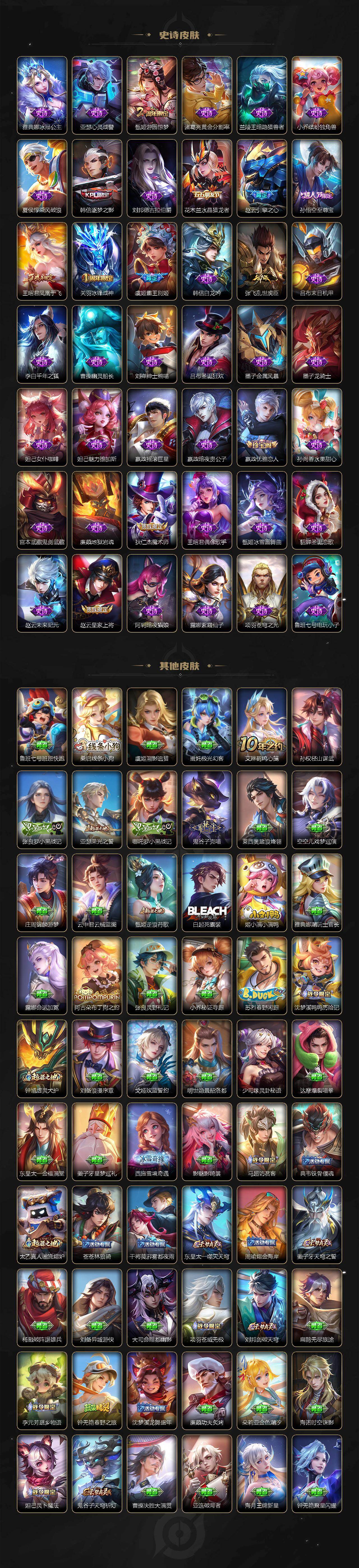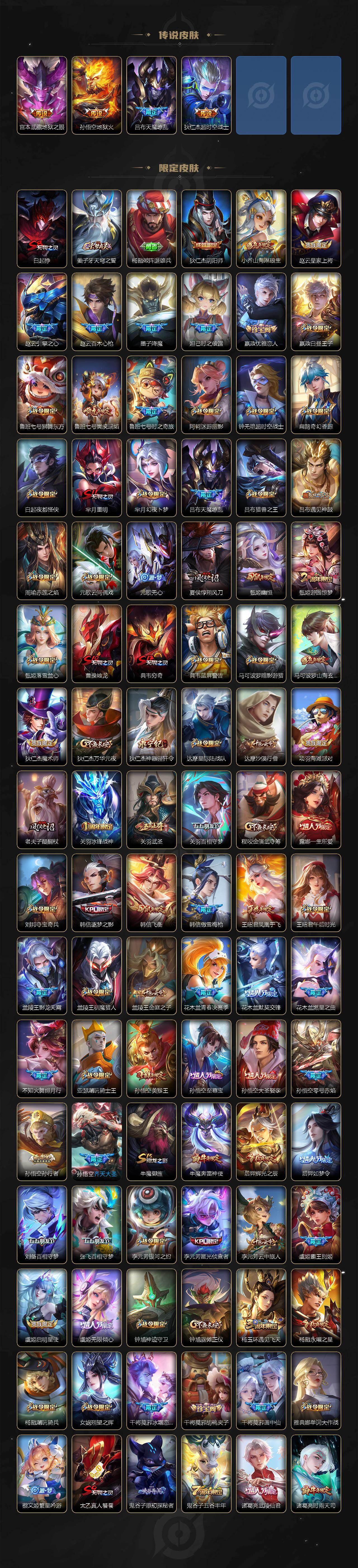 【英雄全皮】:嬴政全皮,姜子牙全皮,刘邦全皮,孙权全皮,刘备全皮,黄忠全皮,狂铁全皮,猪八戒全皮,敖隐全皮,阿古朵全皮,夏洛特全皮,戈娅全皮,空空儿全皮