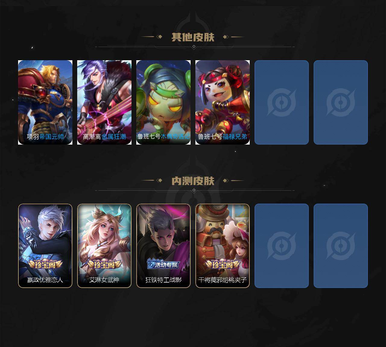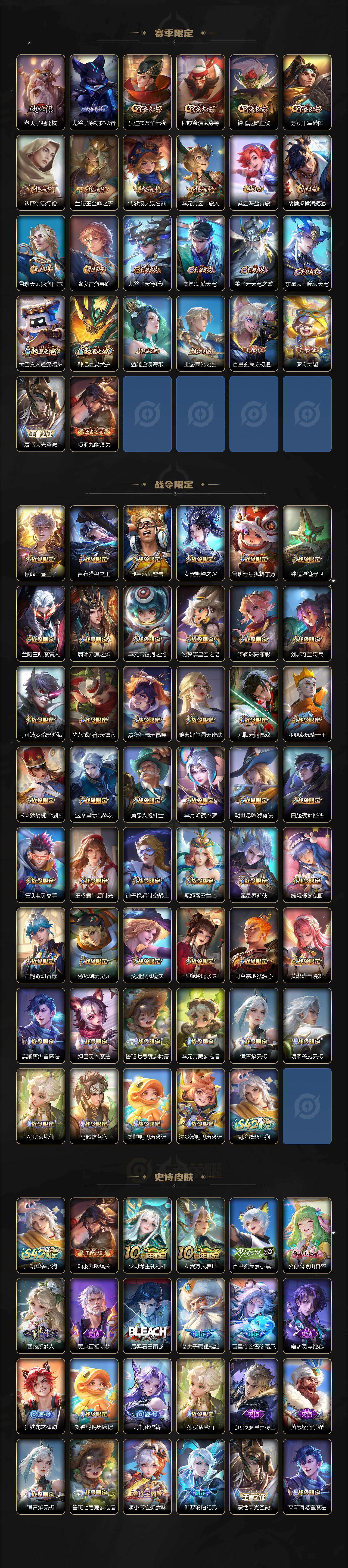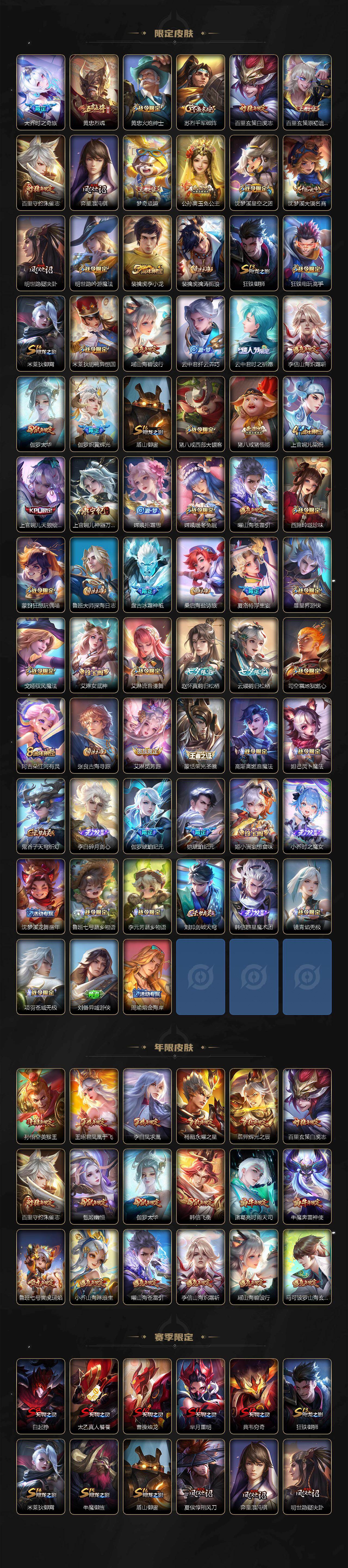 【英雄全皮】:嬴政全皮,姜子牙全皮,刘邦全皮,孙权全皮,刘备全皮,黄忠全皮,狂铁全皮,猪八戒全皮,敖隐全皮,阿古朵全皮,夏洛特全皮,戈娅全皮,空空儿全皮