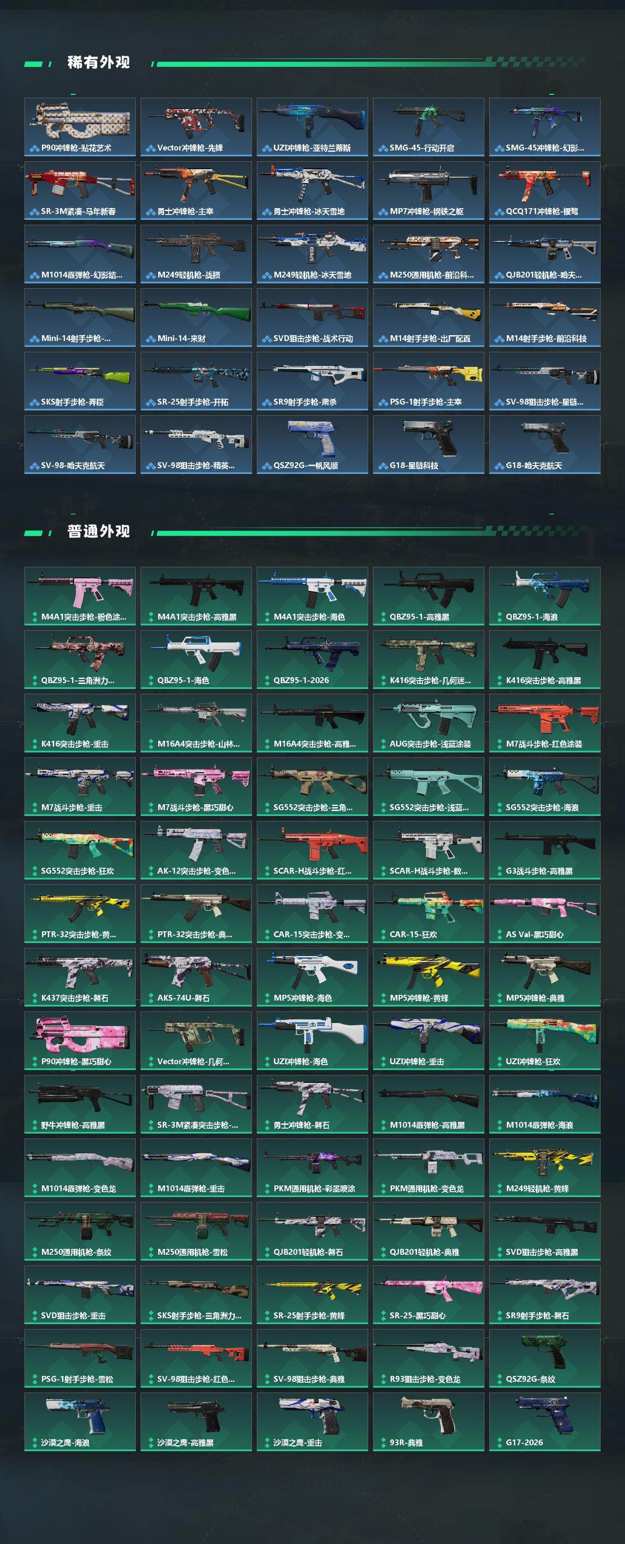 【传说外观】:ASh-12战斗步枪-鹅鸭杀,K416突击步枪-行动记录,AUG突击步枪-悠然茶歇,M7战斗步枪-怜悯,SG