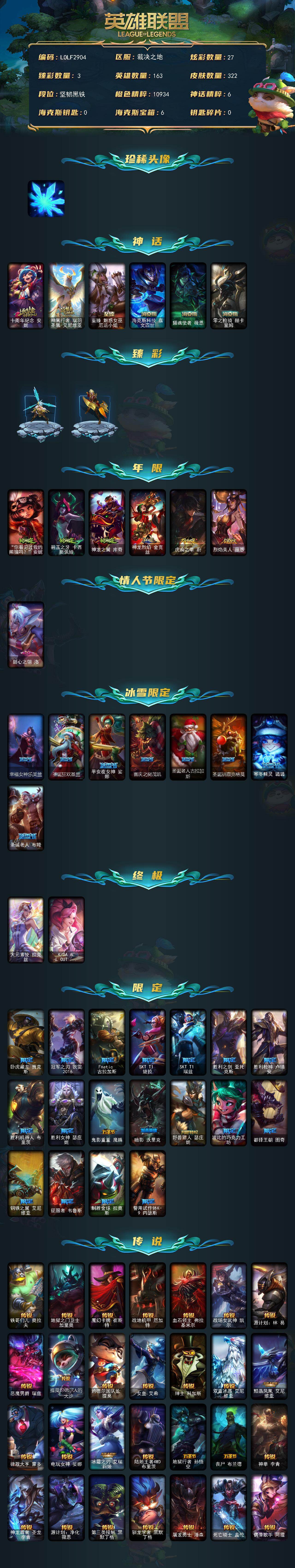 【LOLF2904】163英雄/322皮肤/4终极/6神话/33限定/3臻彩/27炫彩/37传说/95史诗/未定级/雪花头像/十周年纪念安妮/神凰行者瑞羽圣凰艾尼维亚/至臻魅惑女巫厄运小姐/海克斯科技嘉文四世/摄魂使者薇恩/零之枪骑赫卡里姆/冰霜之刃艾瑞莉娅炫金/征服者韦鲁斯炫金/冠军之刃锐雯2016凯旋圣装/你看见过我的熊猫吗安妮/碧玉之牙卡西奥佩娅/神龙之翼库奇/神龙烈焰金克丝/虎痴之拳蔚/烈焰美人薇恩/甜心之翎洛/幸福女神乐芙兰/圣诞狂欢基兰/平安夜女神娑娜/喜庆之树茂凯/圣诞老人古拉加斯