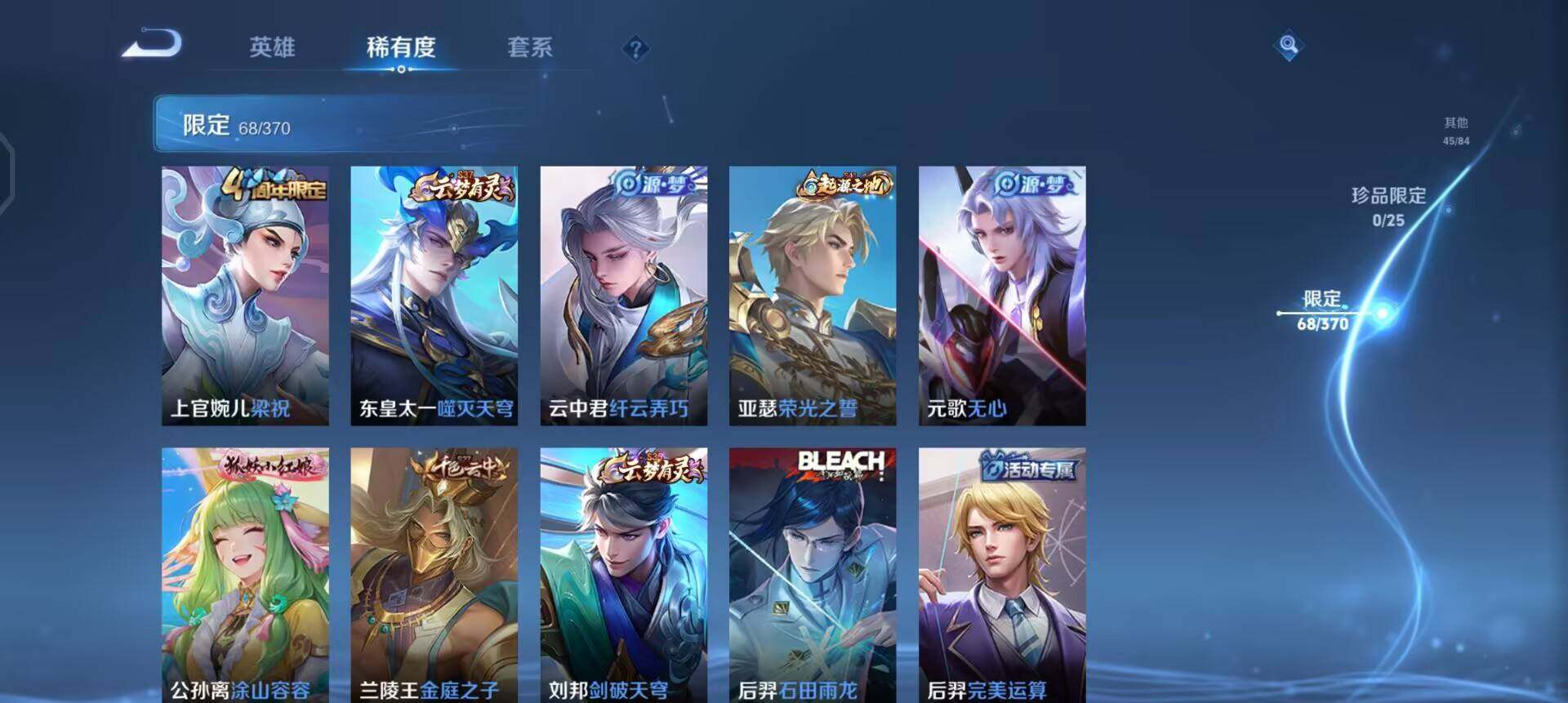 【传说皮肤】:云缨幻光神枪,桑启鸣野蒿,狄仁杰神器狴犴令,马超无双飞将,曜李逍遥 ,李信一念神