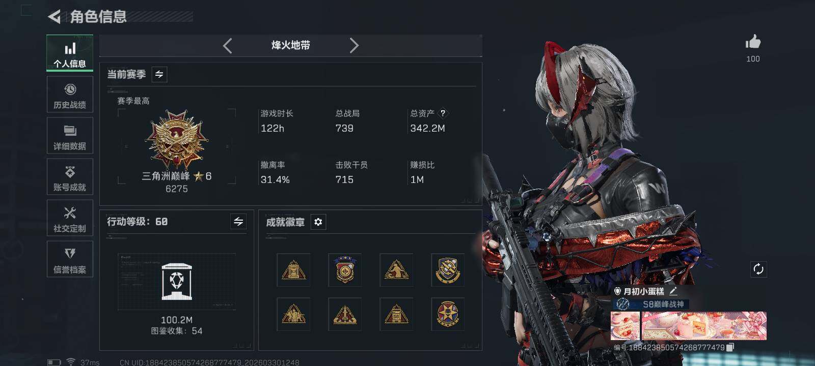 342m总资产-63562k哈夫币-60烽火等级-三角洲巅峰-33战场等级-尉