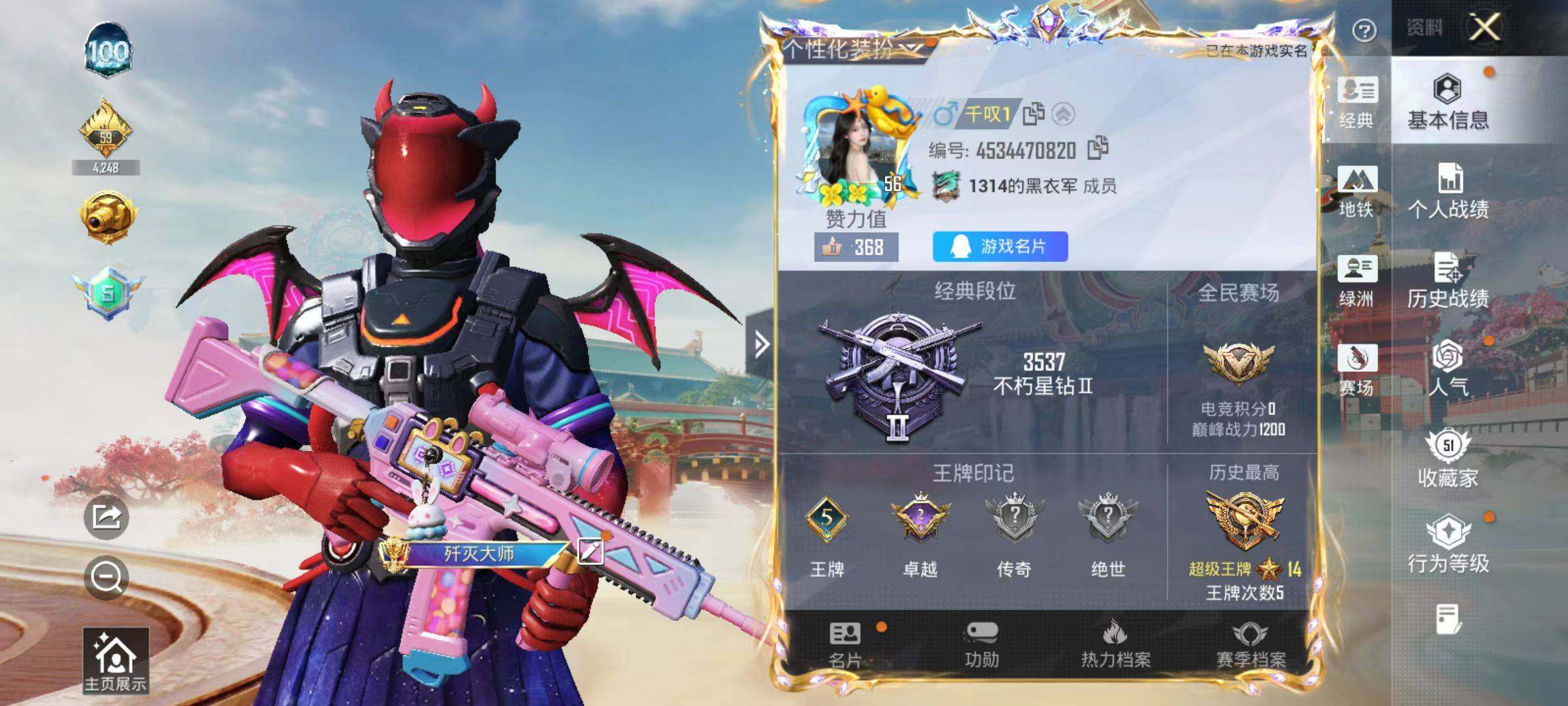 133套装/枪械12/装备242/载具1/战备148/王牌印记8/热力值62842/七级AKM-梦之光华/七级SCAR-L-纯梦嫁纱/三级SCAR-L-灵驹仙姬/五级AUG-暖羊咩咩/六级蜜獾-异瞳寒姬/一级ACE32-萌骑漫游/五级UMP45-量子极限/五级AKS-74U-森灵之息/五级Kar98K-巳巳如意/五级Mk14-福马献瑞/五级DP-28-豹影疾电/五级MG-36-幻彩电音/派对舞王