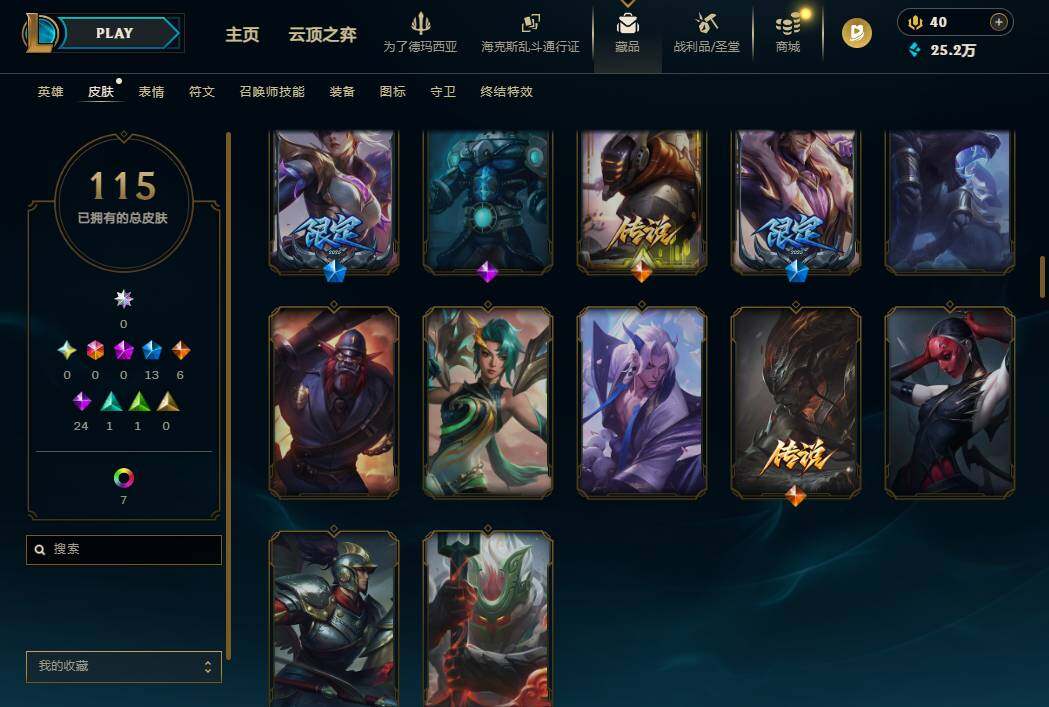 172英雄/115皮肤/14限定/5臻彩/11炫彩/6传说/