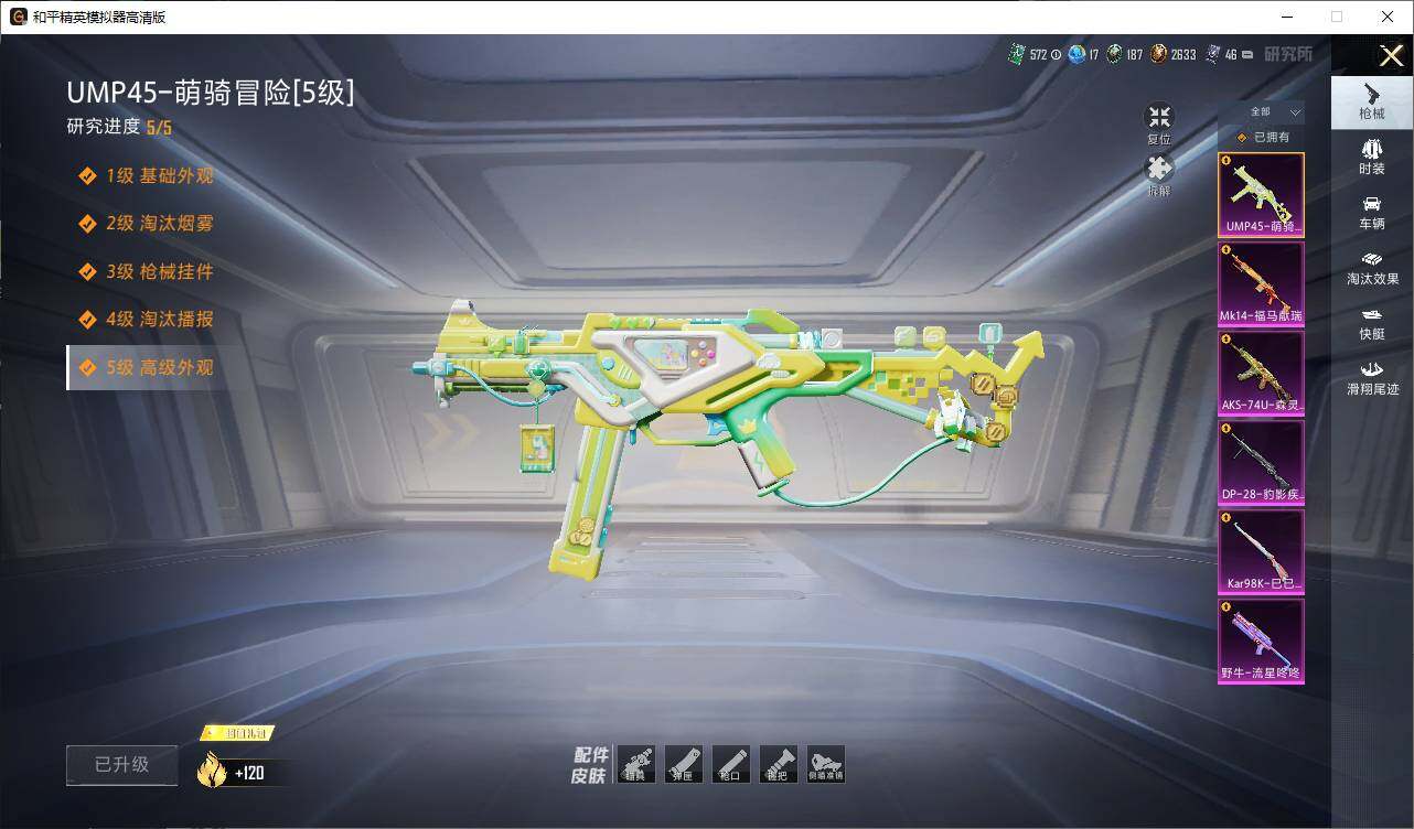 【粉色枪皮等级】:UMP45-萌骑冒险(五级),野牛-流星咚咚(七级),AKS-74U-森灵之息(五级),Kar98K-巳巳如意(五级),Mk14-福马献瑞(五级),DP-28-豹影疾电(五级)
