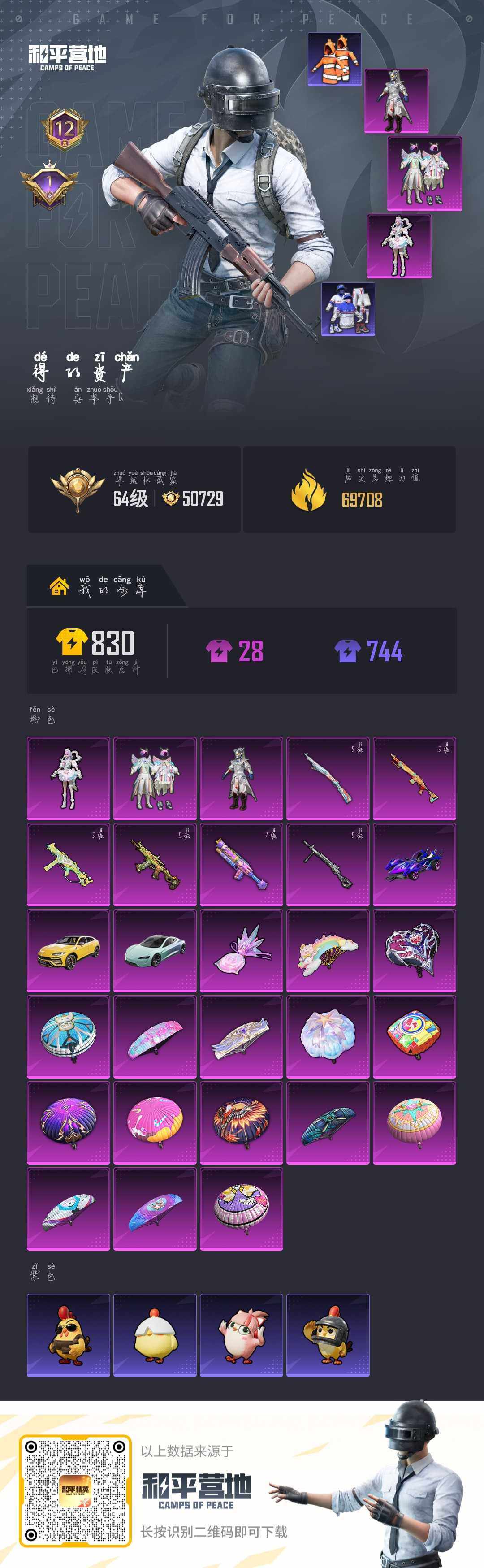 安卓 手Q-3粉装-6特效枪-3载具-1粉色飞行器-69708热力值-12王牌印记-182套装-232枪皮