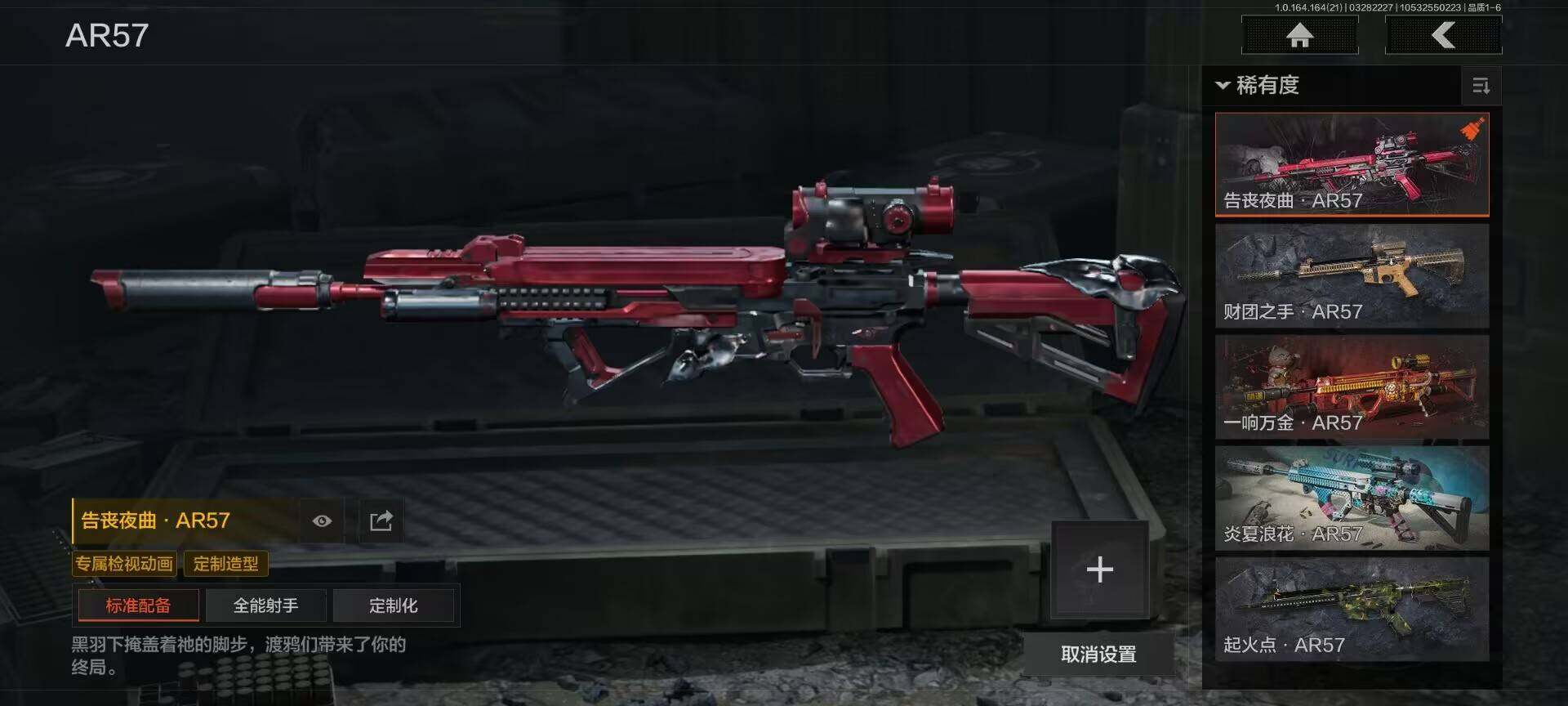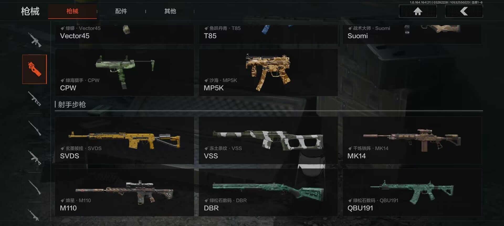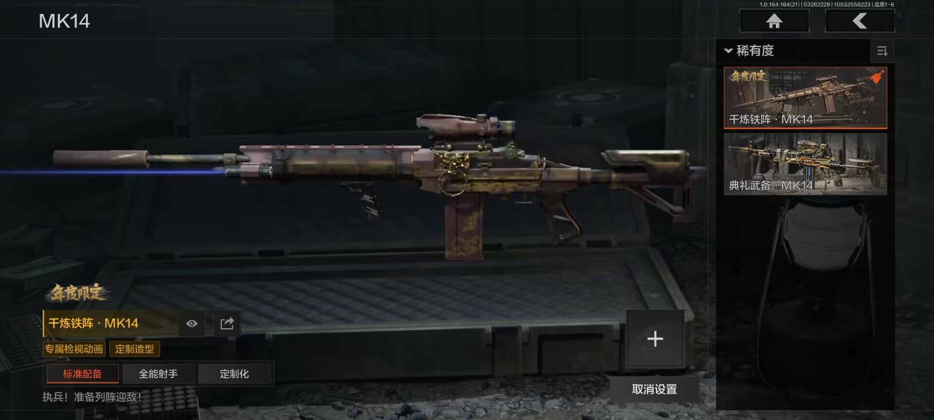 【金色枪皮】:近卫荣誉RPK16,千炼铁阵MK14,旧王圣谕QBZ191,战术大师AN94,百锻铁骑AEK,告丧夜曲AR57,竞技风潮M4A1