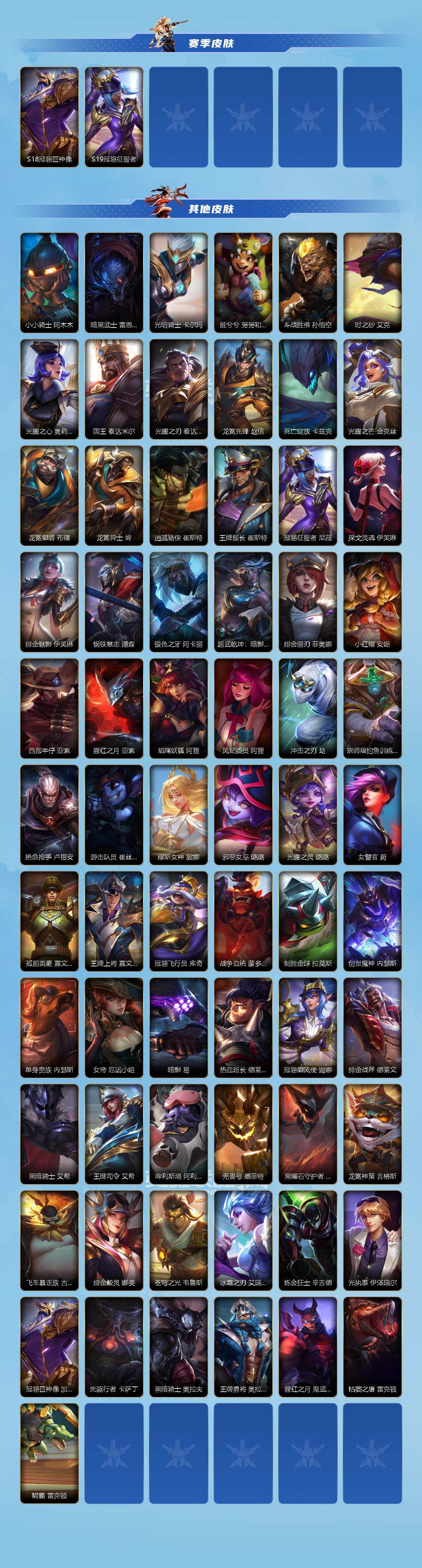 【传说皮肤】:源计划:净化 薇恩,光明哨兵 薇恩,星之守护者 阿卡丽,K/DA ALL OUT 萨勒芬妮,黑夜使者 亚索,星之守护者 阿狸,灵魂莲华 阿狸,天煞 劫,星之守护者 陨 洛,跳跳倩影 厄运小姐,灵魂莲华 瑟提,黎明使者 永恩,西部魔影 永恩,源计划:林 易,灌篮高手 德莱厄斯,黎明使者 锐雯,西