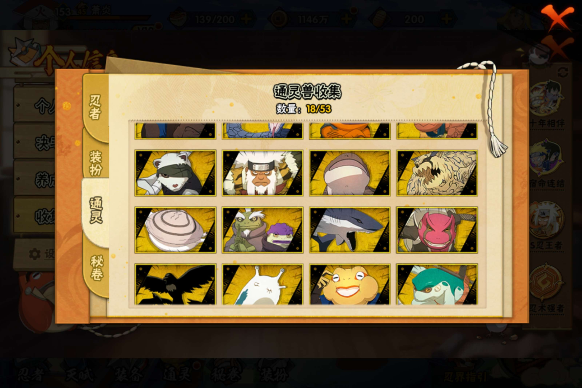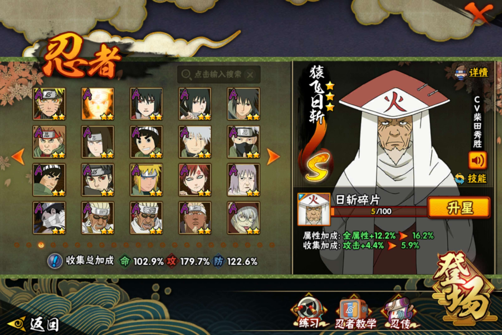 【S级忍者】宇智波带土「忍界大战」(3星),宇智波斑「木叶创立」(3星),迈特凯「死门」(3星),旗木卡卡西「须佐能乎」(3星),自来也「传说中的三忍」(3星),宇智波斑「秽土转生·解」(3星),宇智波佐助「永恒万花筒」(3星),大筒木桃式(3星),神秘面具男「红夜之刃」(3星),大筒木金式(3星),艾「忍界大战