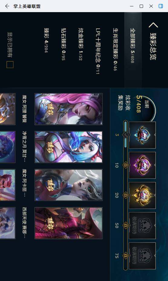 【臻彩皮肤】:冠军典狱长锤石凯旋圣装,西部天使赛娜贝利尔之怠,魔女阿卡丽虚荣,魔女阿狸饕餮,净雪之月莫甘娜冬虹