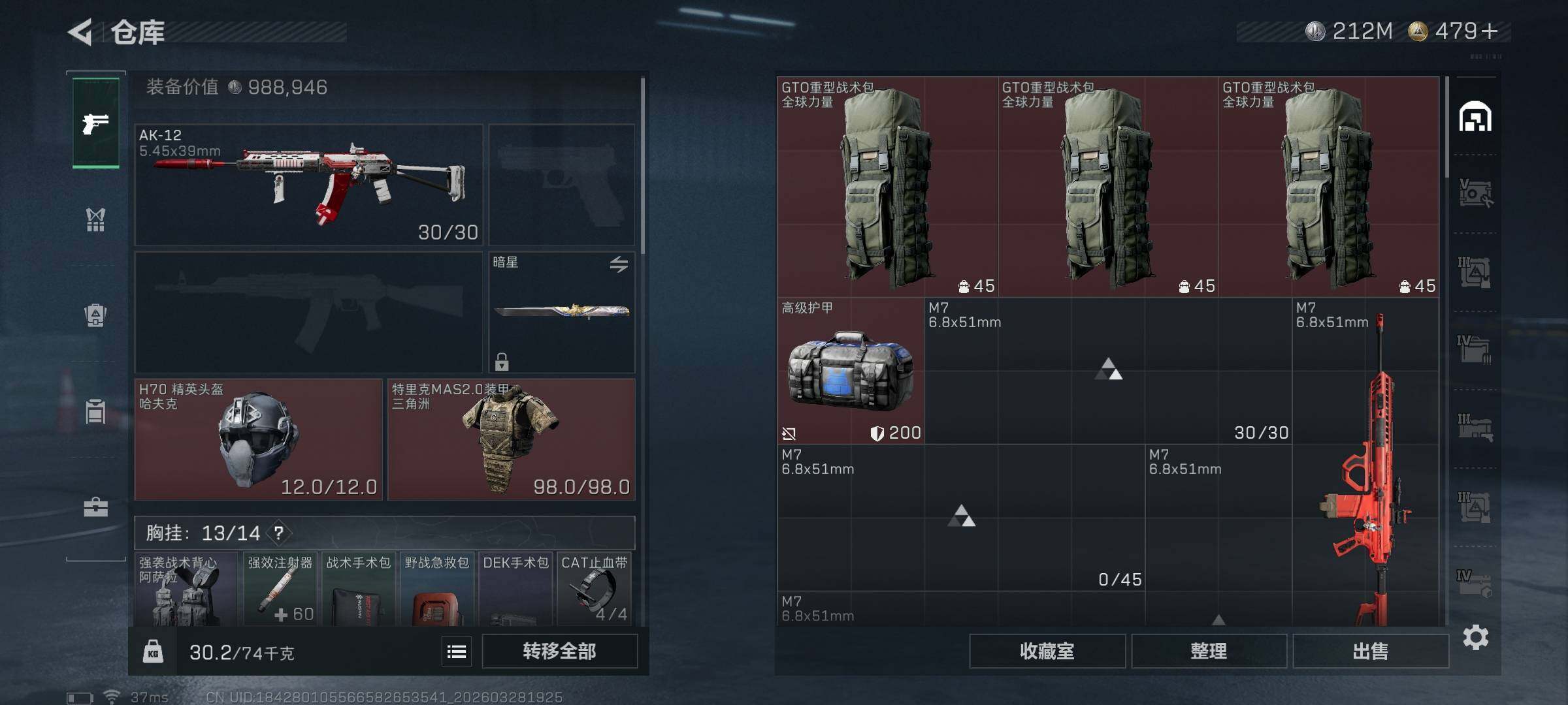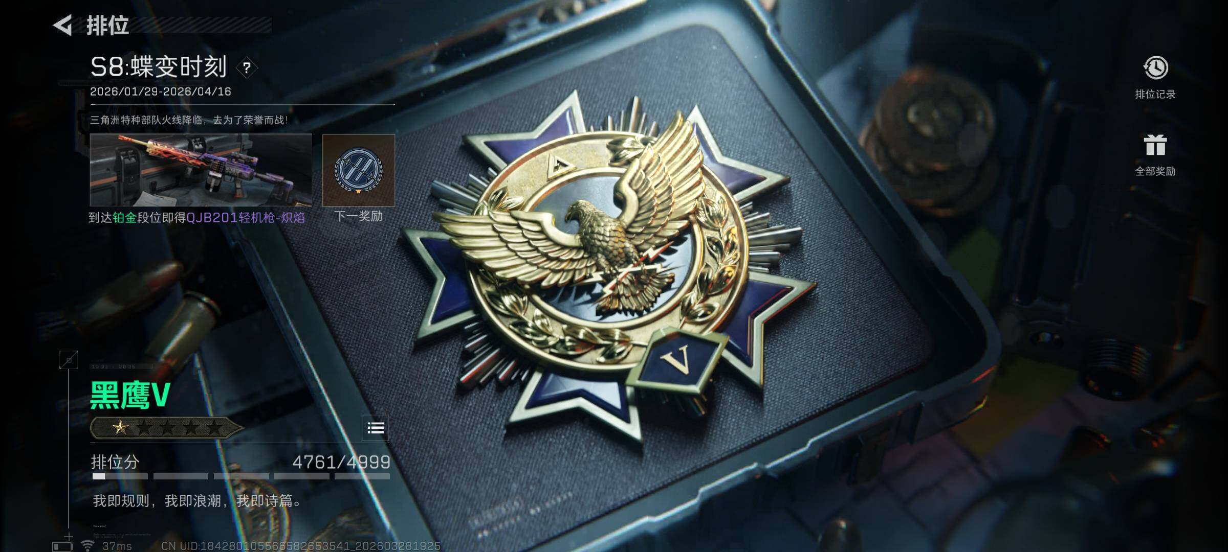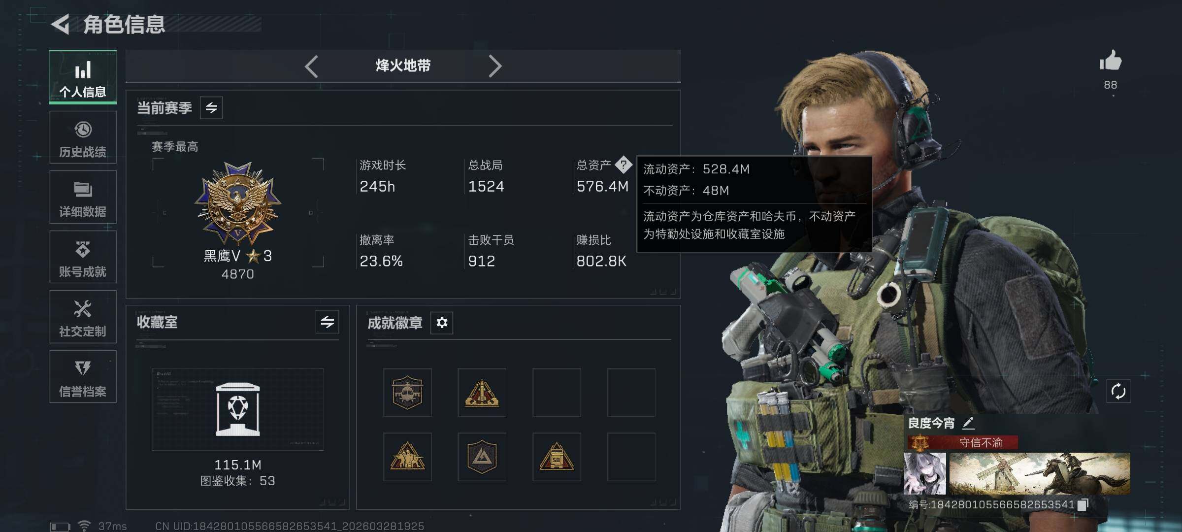 总资产(M):576M/哈夫币(K):212517K/ 传说枪皮数:23/全面战场等级:21_段位:军士长/烽火地带等级:60_段位:黑鹰/