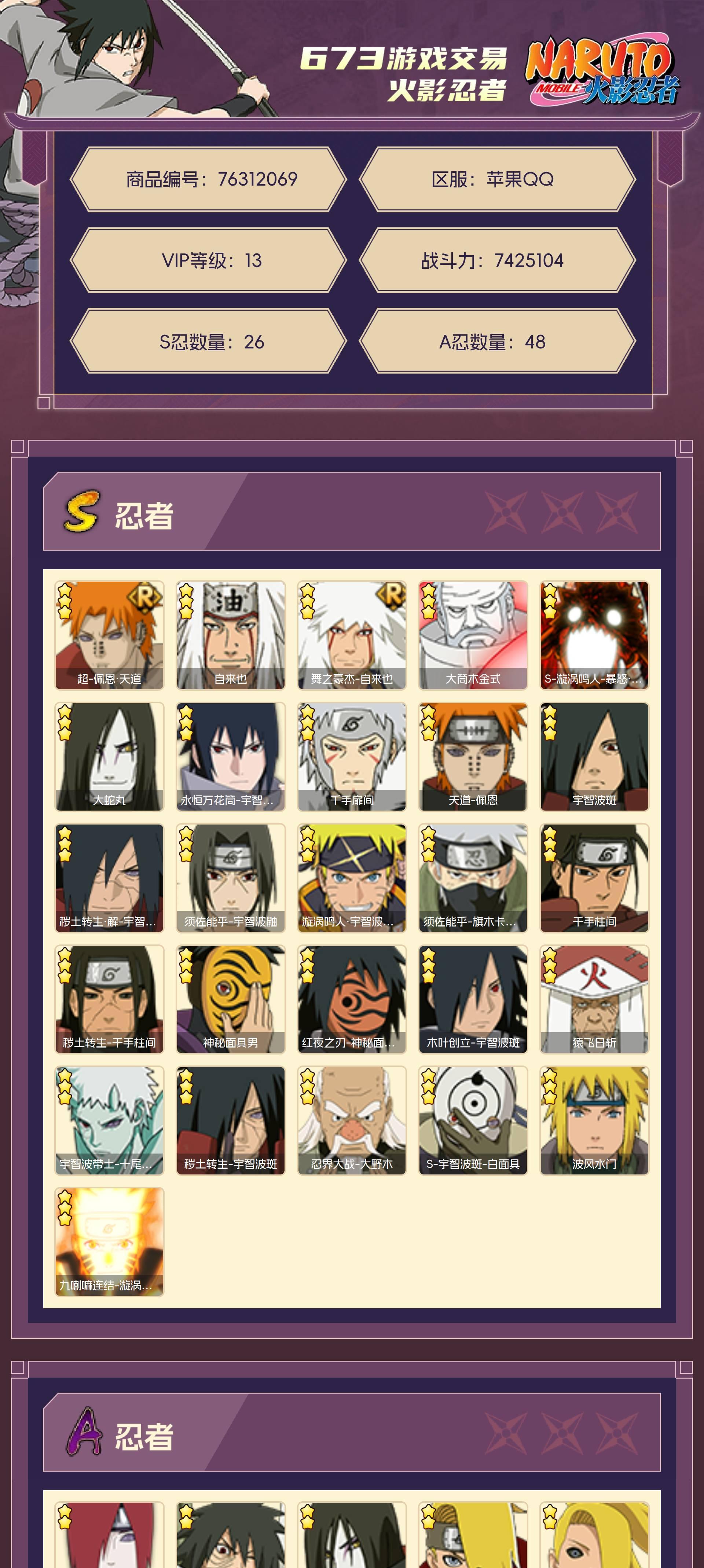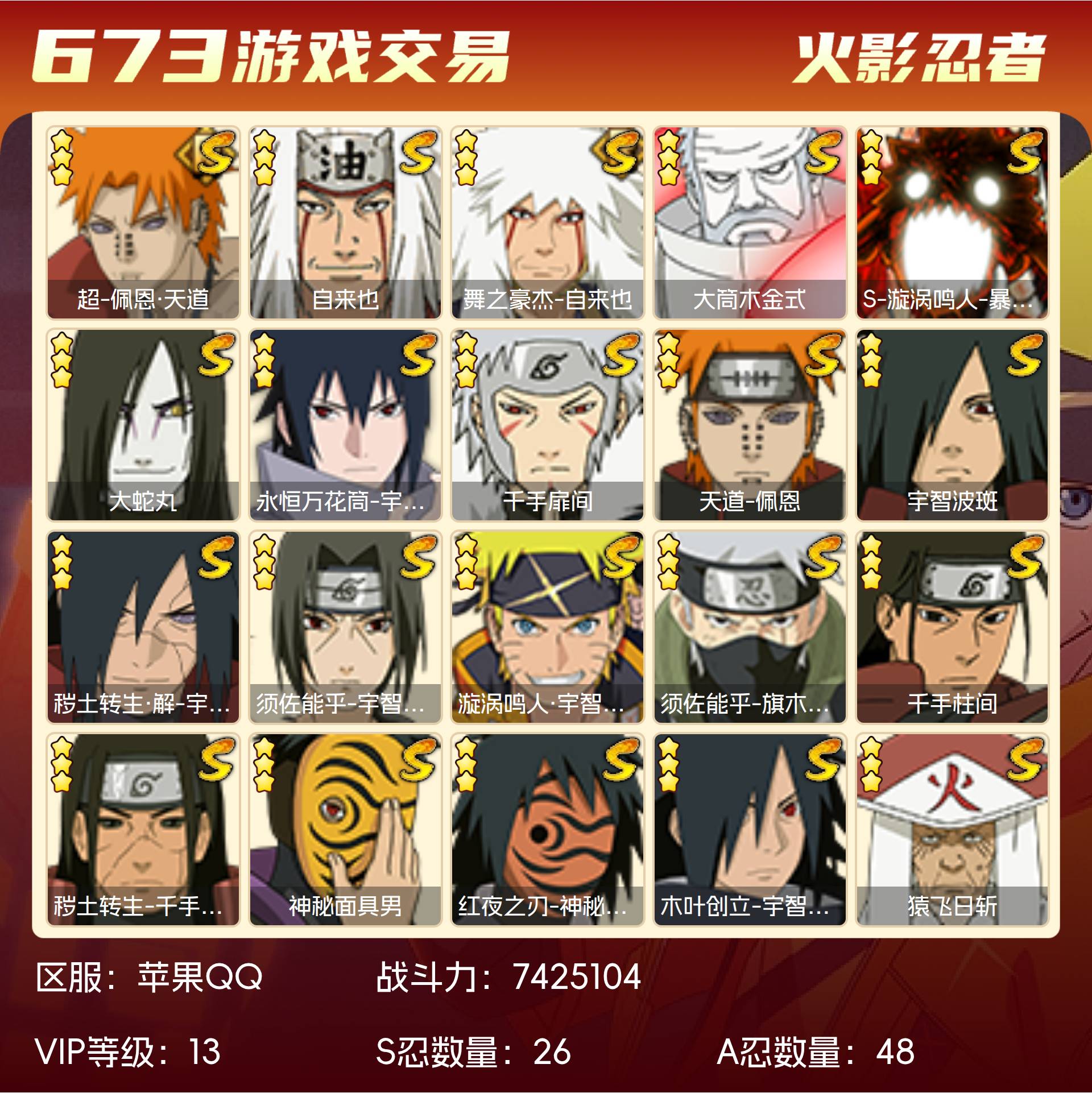 VIP13,742W战力S忍20个,A忍43个,通灵兽18个,熊猫,天道超,黑绝,创立斑,十尾带土