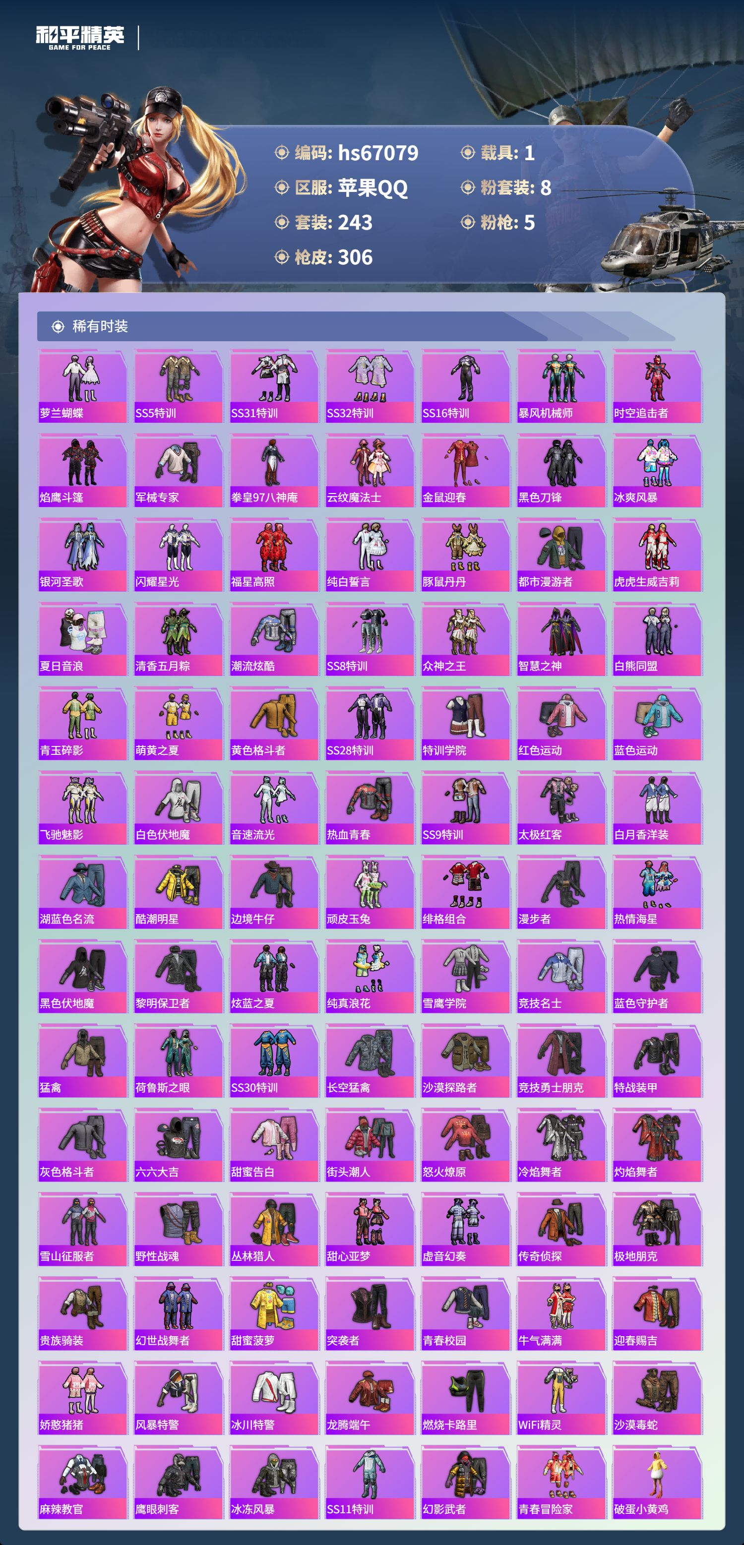 12王牌印记-有战神框-1红装-8粉装-5特效枪-1载具-热力值-243套装-306枪皮-3卓越印记-1传奇印记